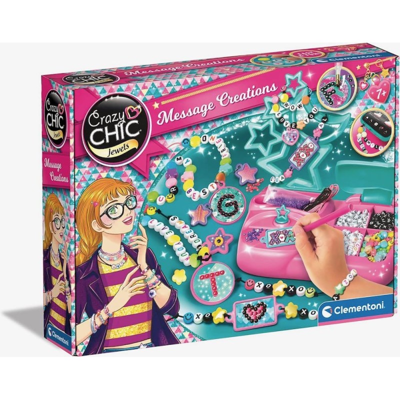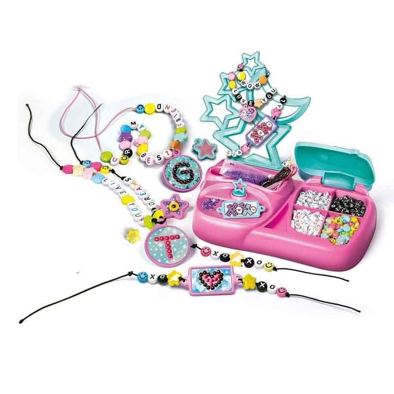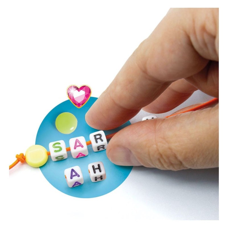 Edad recomendada: +7 años. Kit para crear joyas y accesorios de moda con letras, cuentas de colores, gemas brillantes y cordones elásticos. Pulseras y collares de colores vivos en los que se puede escribir el nombre o las etiquetas favoritas para expresar tu creatividad y tu estilo único.