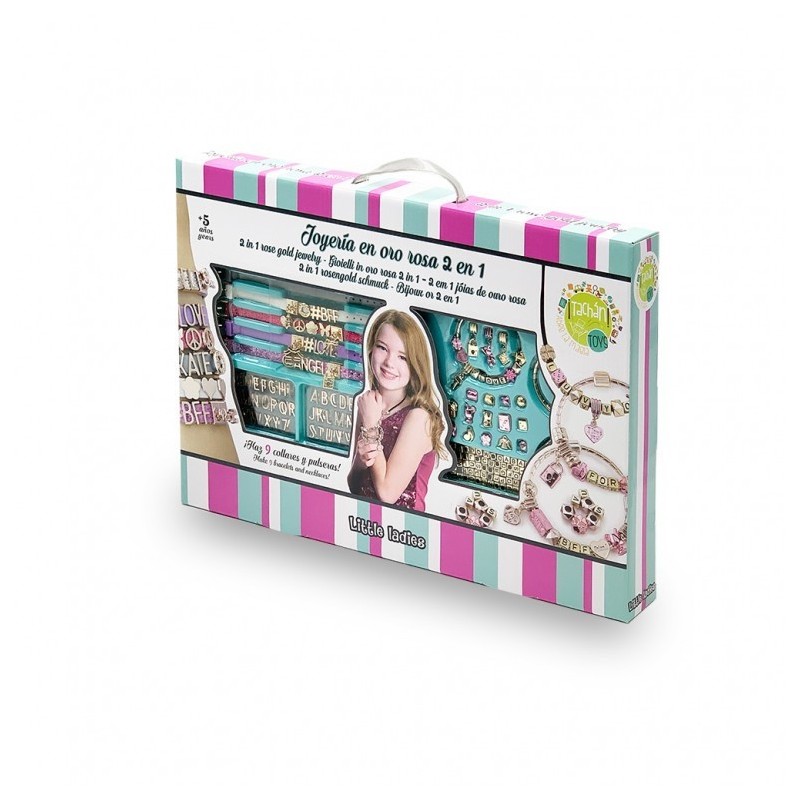 Edad recomendada: +5 años. Caja maletín con gran variedad de cuentas imitando al oro de color rosa. Incluye dados con letras, letras grandes, formas geométricas y colgantes diversos. Las pulseras y collares se pueden hacer sobre diferentes tipos de cuerdas, planas o metálicas, creando joyas modernas y divertidas.