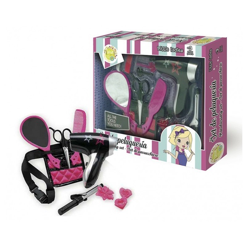 Edad recomendada: +3 años. Juego de peluqueria compuesto por secador, tijeras, peine y demás accesorios.Todo lo que necesita un peluquero, con este juego, se puede llevar comodamente en la cintura gracias a su cinturón adaptable donde llevar las herramientas mientras se juega.El secador funciona con pilas.