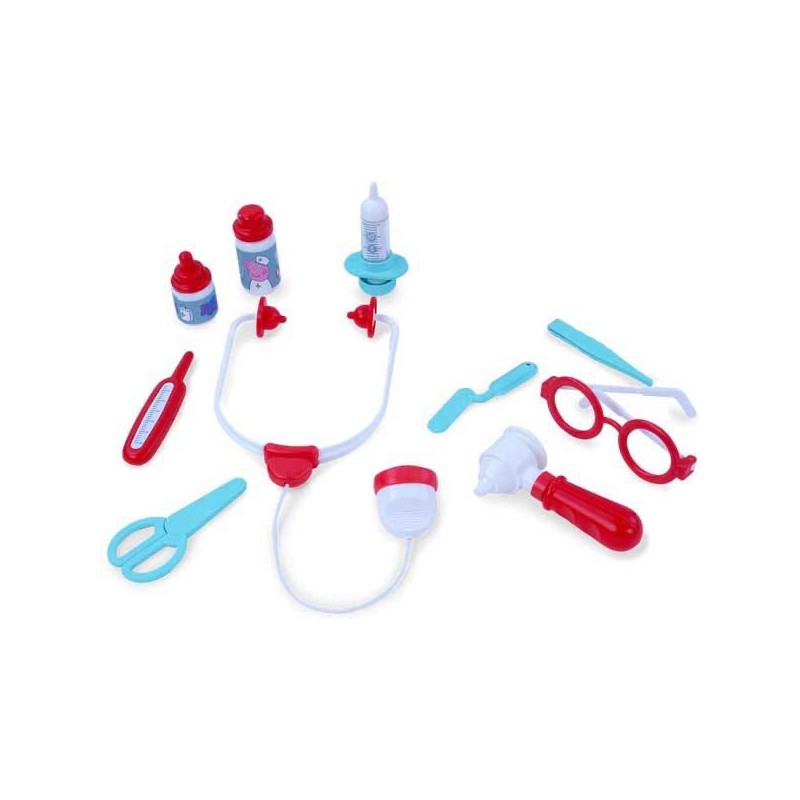 Completo maletín médico para niños con motivos de Peppa Pig. Incluye 10 accesorios: termómetro, tijeras, gafas, aparato para mirar los oídos, estetoscopio, pinzas y más. Edad recomendada: +3 años.