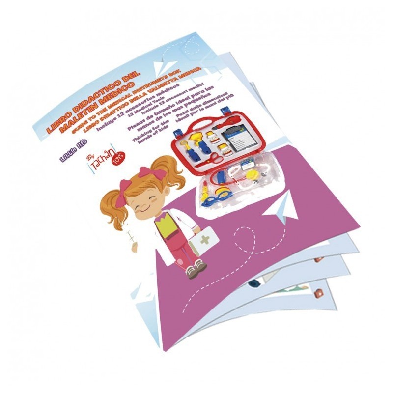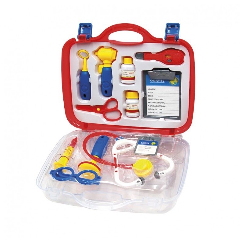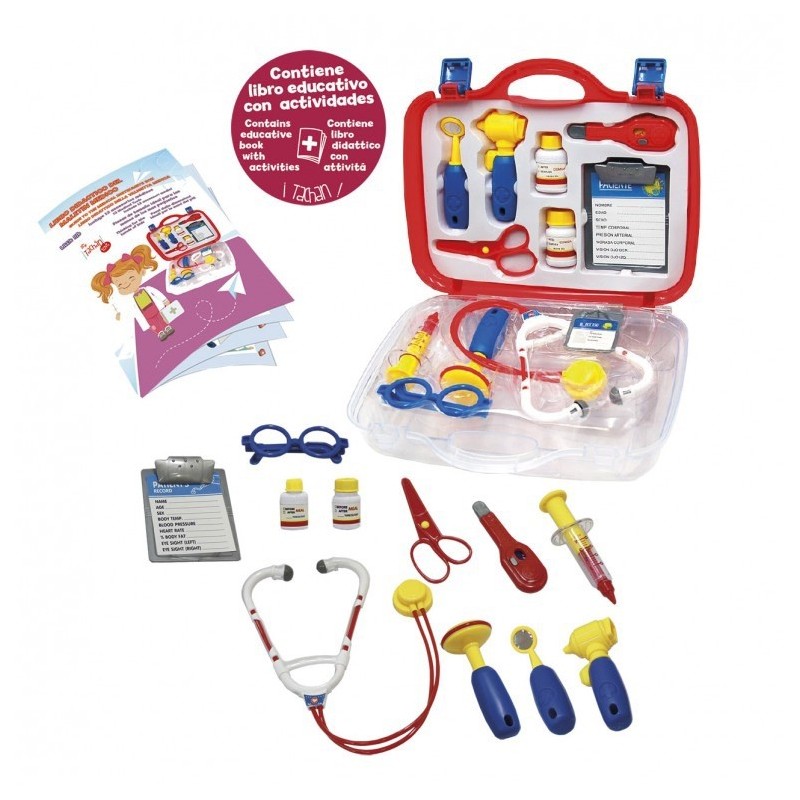 Edad recomendada: +3 años. Completísimo maletínn médico con todos los accesorios imprescindibles: estetoscopio, laringoscopio, termómetro, jeringuilla, bote de muestras, otoscopio, tijeras, gafas, block de pacientes, tarjeta de identificación y tijeras.