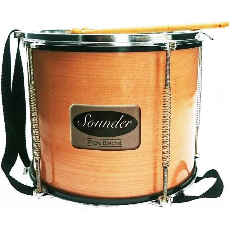 Tambor timbal infantil de gran tamaño que imita un tambor de adulto real. Dispone de parches especiales, aros metalizados, cinta bandolera y un par de baquetas. Dimensiones: diámetro 25 cm, altura 20 cm. Edad recomendada: +3 años.