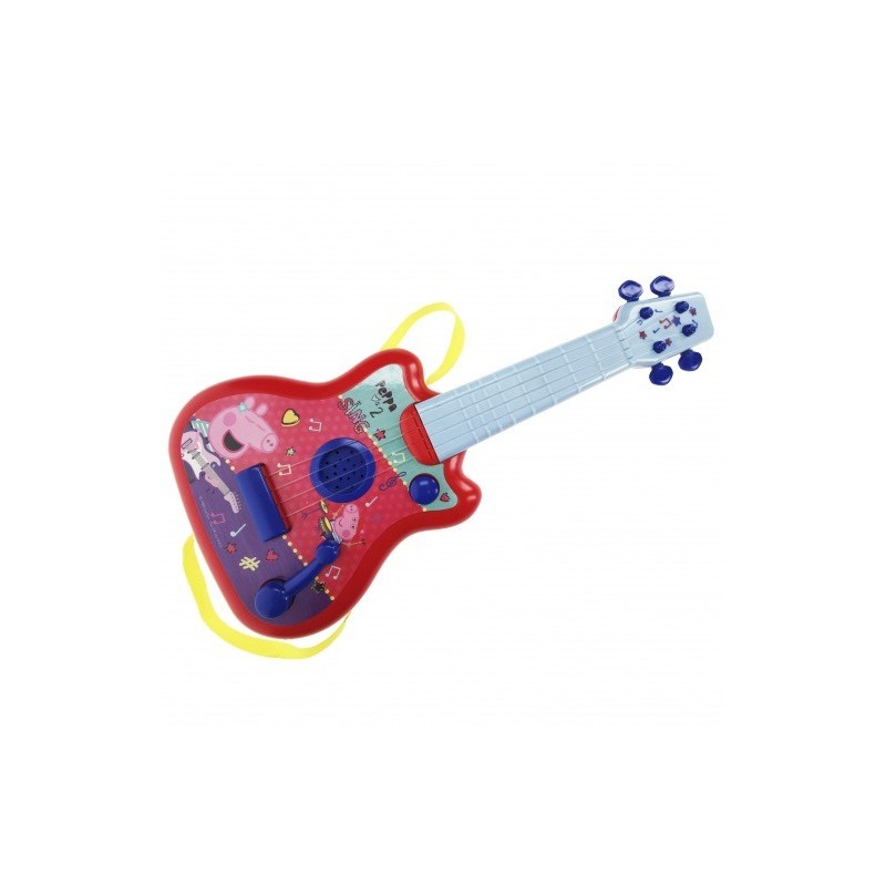 Medias aproximadas guitarra: 35x15x4 cm. Edad recomendada: +3 años. Guitarra de colores con 4 cuerdas ajustables. Está tematizada con la serie de dibujos Peppa Pig. La guitarra es cómoda y de fácil manejo porque no pesa, además incluye una cuerda para colgar la guitarra tipo bandolera. Peppa Pig y su familia te enseñarán a tocar la guitarra, aprende con ellos y crea tus propias composiciones.