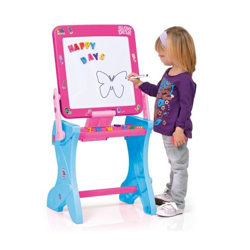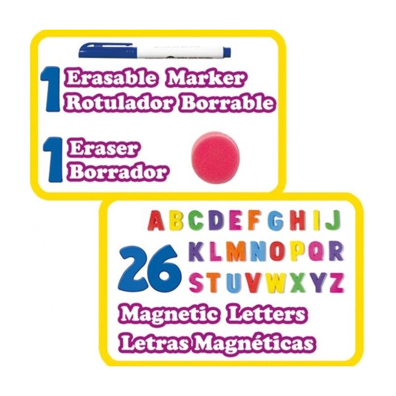 Pupitre, pizarra, y tabla magnética. Tres en uno. Al levantar el tablero es una pizarra y un tablero magnético con el que jugar con las letras, al bajarlo un pupitre de gran estabilidad. Incluye letras magnéticas, rotulador y un borrador. Dimensiones: 90x49x36 cm. INCLUYE: - Rotulador Borrable - Borrador - 26 Letras magnéticas Edad recomendada: +3 años.