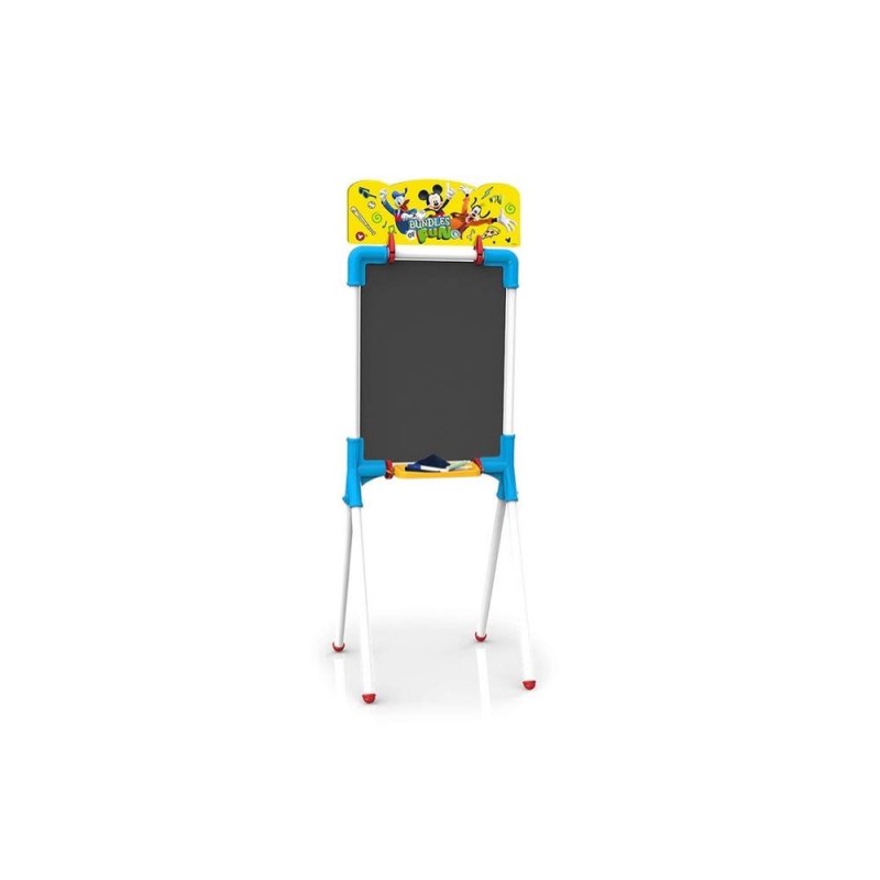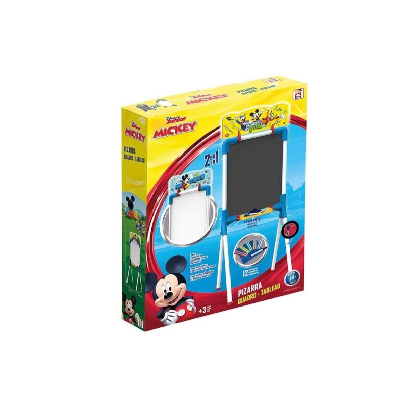 Pizarra infantil reversible de Mickey Mouse. Tiene dos caras: para tizas y para rotuladores. Incluye tizas de colores, un rotulador borrable y un paño para limpiar la pizarra. Dimensiones: 37x32.5x98 cm. Edad recomendada: +3 años.