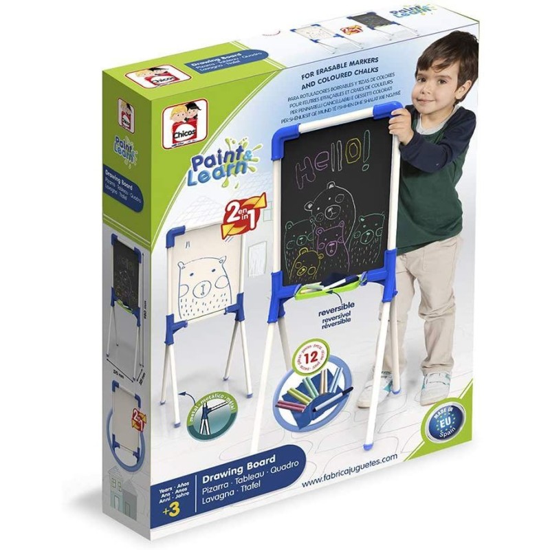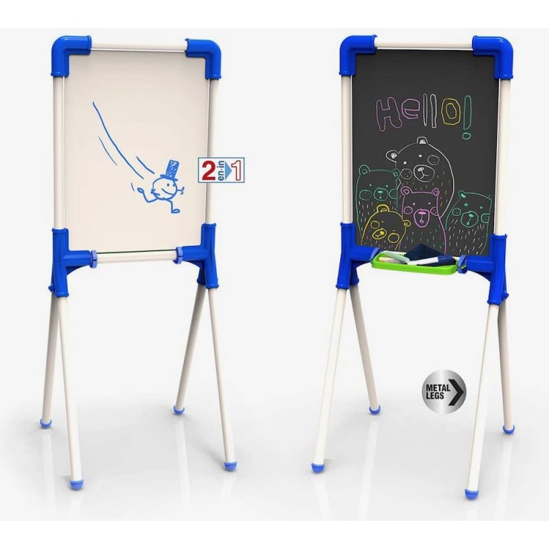 Pizarra infantil de dos caras: tizas y rotuladores. Gracias a su reducido tamaño es adecuada para niños y niñas a partir de 3 años. Se incluyen tizas de colores, un rotulador borrable y un paño para limpiarla pizarra. Los juegos creativos como la Pizarra Junior ayudan a los más pequeños a hacer volar su imaginación y a fomentar su creatividad. Dimensiones: 98x37x32.5 cm. Edad recomendada: +36 meses.