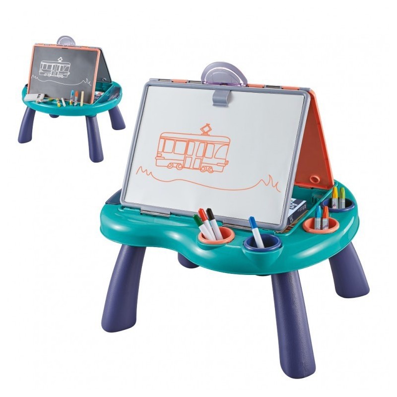 Pizarra de plástico XL con accesorios. Da rienda suelta a tu creatividad con este bonito mesa con doble pizarra para niños. Esta pizarra tiene una doble zona de dibujo compuesta por un lado magnético donde podrás pegar y retirar letras, números... o bien dibujar y borrar todas las veces que quieras con el marcador mágico. El otro lado en lugar es una preciosa pizarra para pintar con tizas. Gracias a su forma pirámide es posible que jueguen varios niños a la vez. La pizarra está apoyada sobre una base de plástico con compartimentos útiles para poder organizar tizas, cepillos, esponjas, letras y números. Tú bebé pasará horas y horas desarrollando su imaginación y creatividad. No recomendado para menores de 3 años. Medidas: 61*7*41cm Contiene 5 tizas, 12 pinturas,4 rotuadores, 1 borrador y 1 cuaderno con 20 hojas.
