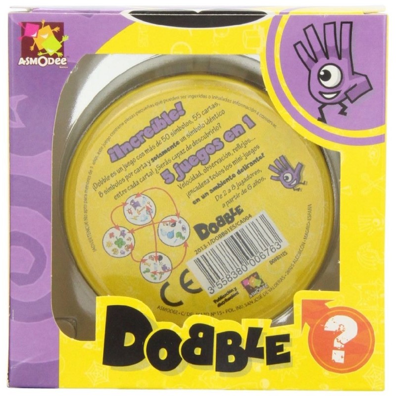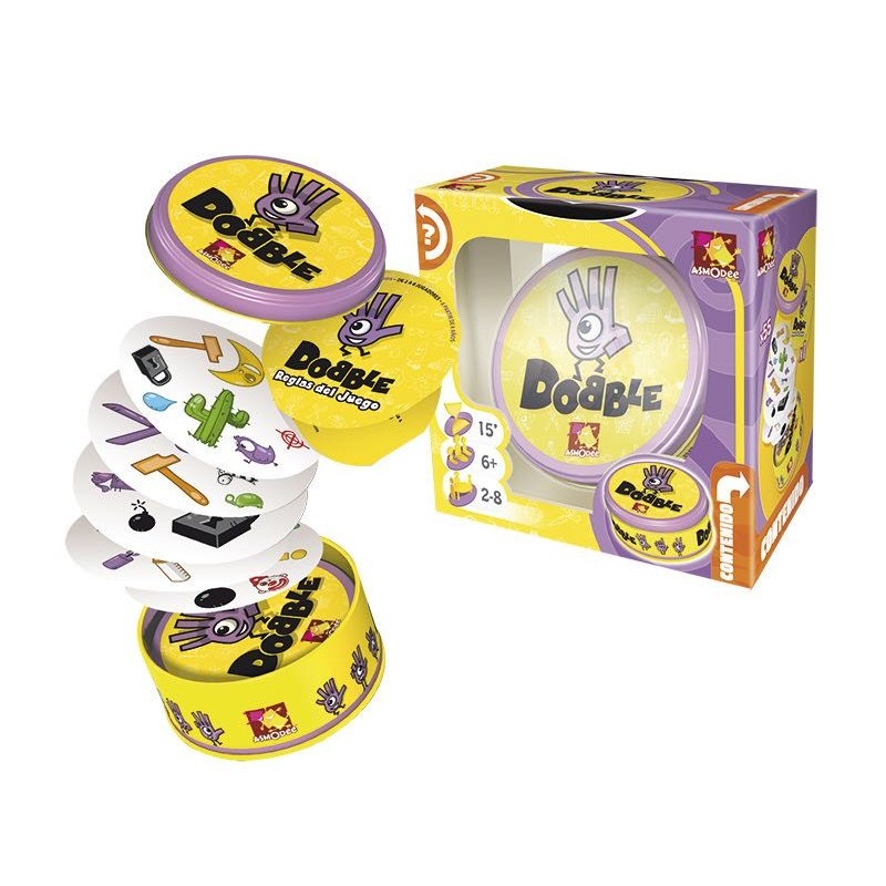 Dobble, un juego con más de 50 símbolos, 55 cartas, con uno, y solamente un símbolo idéntico entre cada carta. ¿serás capaz de descubrirlo? Busca el símbolo idéntico en dos cartas, dilo en voz alta y coge o deja una carta, según las reglas del mini-juego al que estéis jugando. Velocidad, observación, reflejos.. ¡encadena todos los mini-juegos en un ambiente delirante! Para 2-8 jugadores. Edad recomendada: a partir de 6 años.