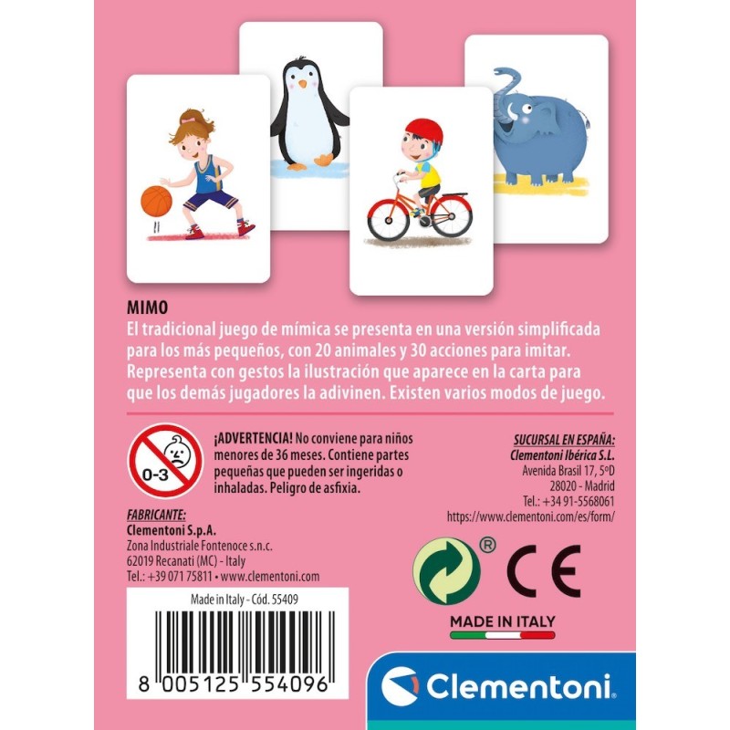 ¡El tradicional juego de mímica creado específicamente para niños de preescolar! El juego contiene 50 cartas con simpáticos personajes en divertidas poses y poniendo caras graciosas. El objetivo del juego es imitar la acción o el animal ilustrado en la tarjeta para que los otros jugadores intenten adivinarlo. Gana el jugador que adivine más imitaciones. Edad recomendada: +4 años.