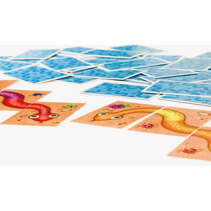 Edad recomendada: +4 años. ¡Los colores de la serpiente están desordenados! ¿Quién puede ayudar a poner los colores en orden? Rojo con rojo, azul con azul, amarillo con amarillo... ¡Es fácil! ¿verdad? Completad las serpientes con cabeza, cuerpo y cola y llevároslas a vuestro montón. ¡El que consiga más cartas al final de la partida es el ganador! Un sencillo y vistoso juego con asociación de colores, tipo dominó, para empezar con los juegos de reglas.
