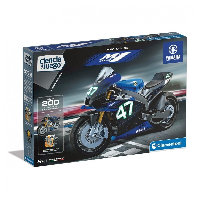 Un kit de construcción con el que divertirse construyendo el modelo de la famosa Yamaha M1, ganadora de muchos Gran Premios de Moto GP. Todos los componentes necesarios para recrear una Yamaha M1 con cambio de 3 velocidades, amortiguadores anteriores y transmisión de cadena. Edad recomendada: +8 años.