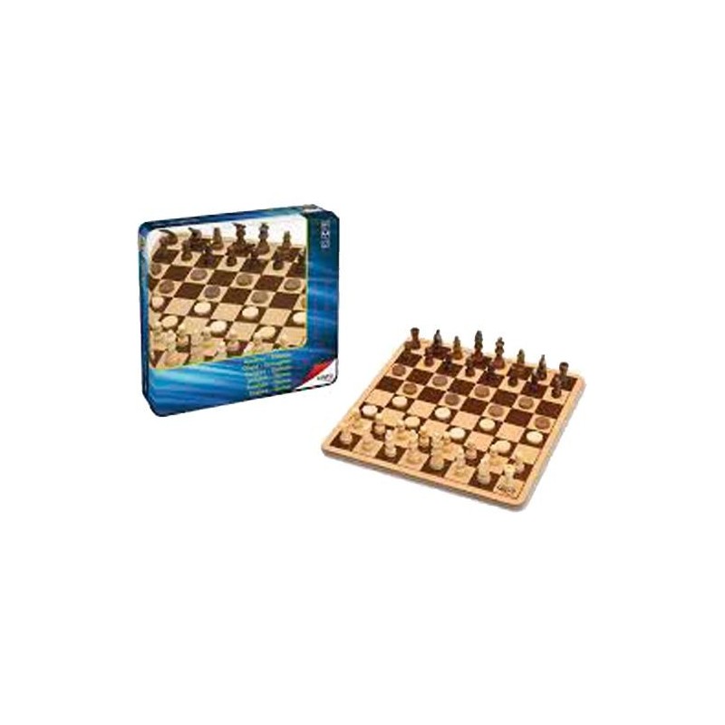 Juego Ajedrez y Damas en caja de metal. Edad recomendada: +7 años.