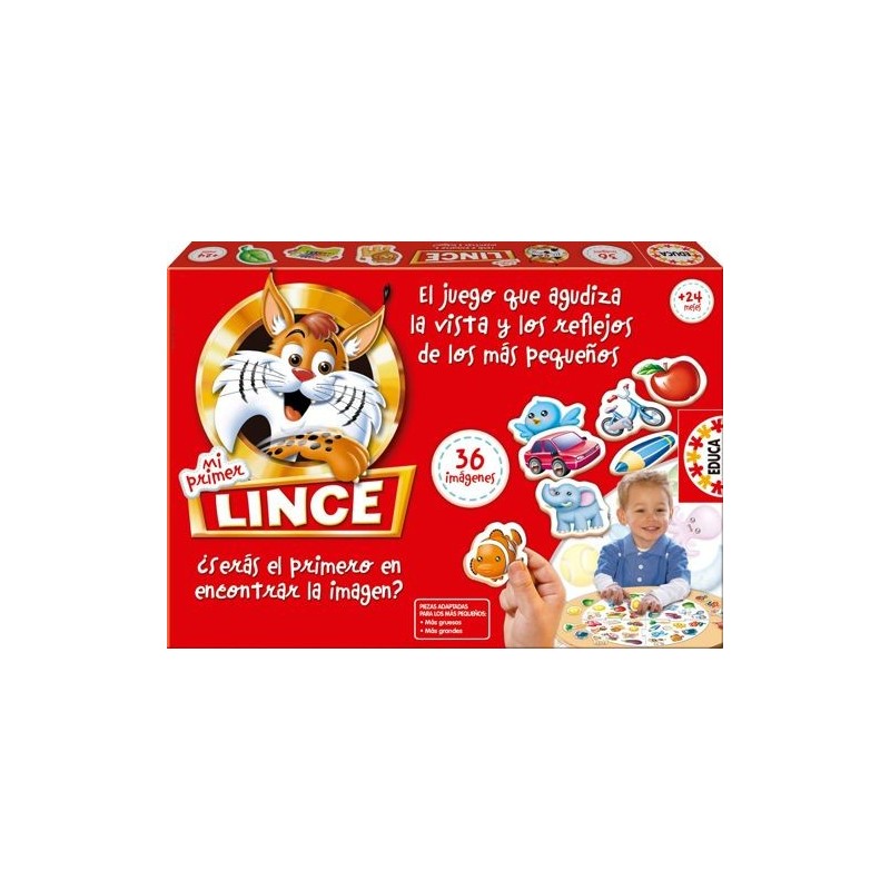 El apasionante juego de competición El Lince en una versión adaptada para los más pequeños (2-4 años). Cada jugador deberá encontrar en el tablero las imágenes cogidas al azar. Refuerza la memoria visual y los reflejos. CONTENIDO: 1 tablero, 36 fichas con imágenes, 1 caja montable, Instrucciones. Edad recomendada: de 2 a 4 años.