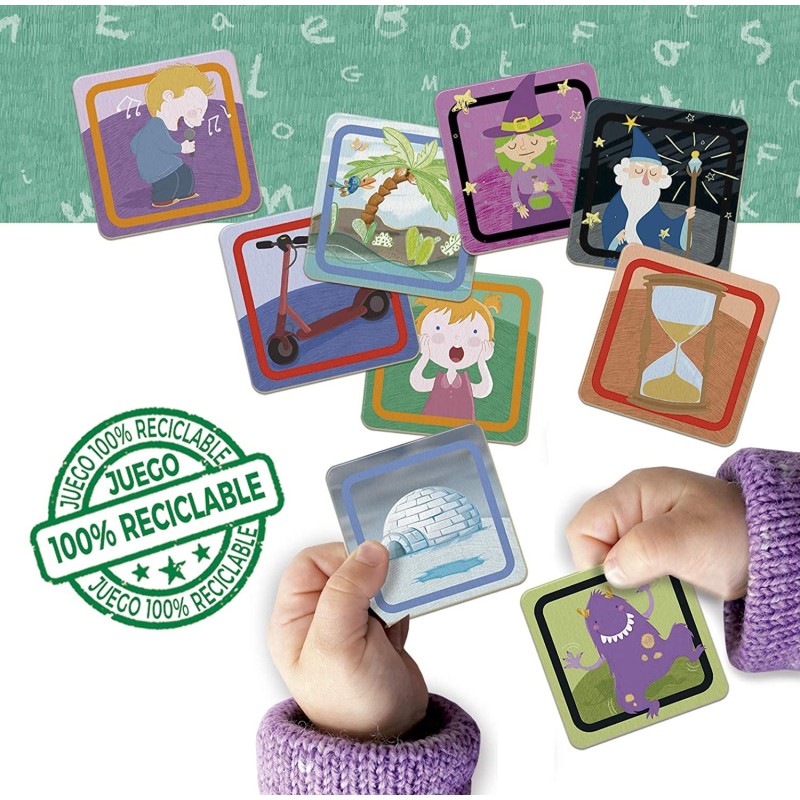 Con este juego, los más pequeños se divertirán creando sus primeras historias. Podrán reforzar la expresión oral y ampliar su vocabulario. Desarrollaran su creatividad e imaginación jugando. Contenido: 72 cartas, ruleta e instrucciones. Edad recomendada: 5-7 años.