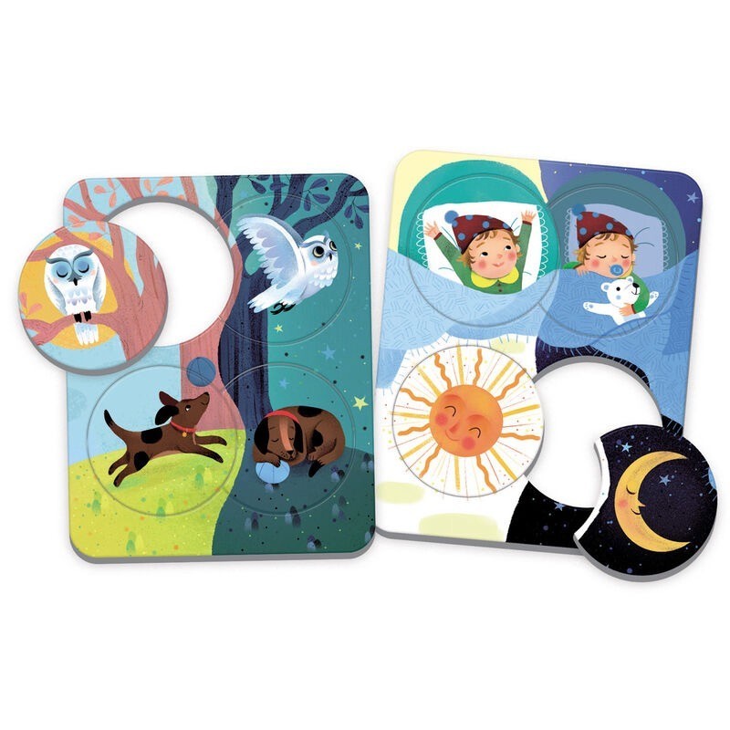 Un juego de asociación para descubrir cómo cambian los objetos, los animales y todo lo que nos rodea durante el día y la noche. Contiene 6 minipuzzles de cartón reciclado, con temas pensados para que los niños entiendan cómo cambian las cosas de día o en la oscuridad de la noche, y conozcan algunos animales nocturnos. Las ilustraciones captan la atención de los niños y los guían en el juego de la asociación lógica, desarrollando su capacidad de observación y concentración. Edad: +2 años.