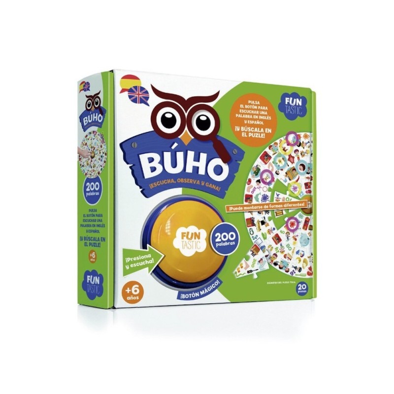 Puzzle botón búho con 200 palabras. Pulsa el botón para escuchar una palabra en inglés o español y ¡Búscala en el puzzle! Edad recomendada: +6 años.