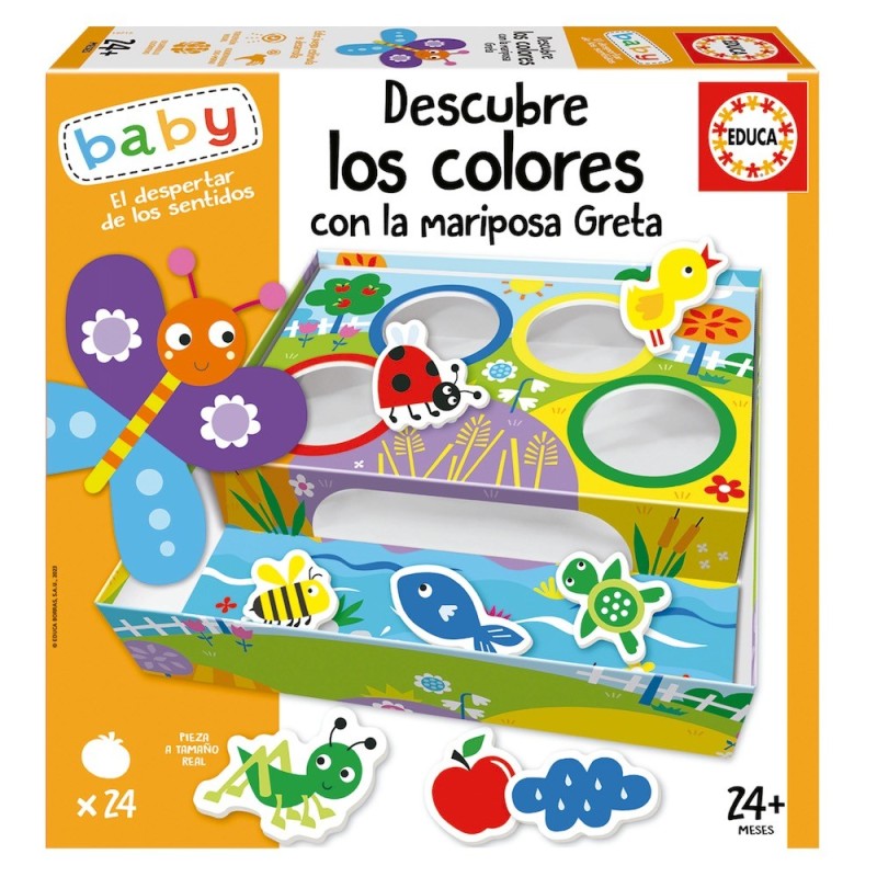 Edad recomendada: +24 meses. El juego para aprender a asociar y diferenciar colores con la Mariposa Greta. Clasifica los elementos por el color correspondiente: Amarillo, azul, rojo y verde. Este juego desarrolla la atención, clasificación, motricidad fina, la curiosidad y la imaginación.