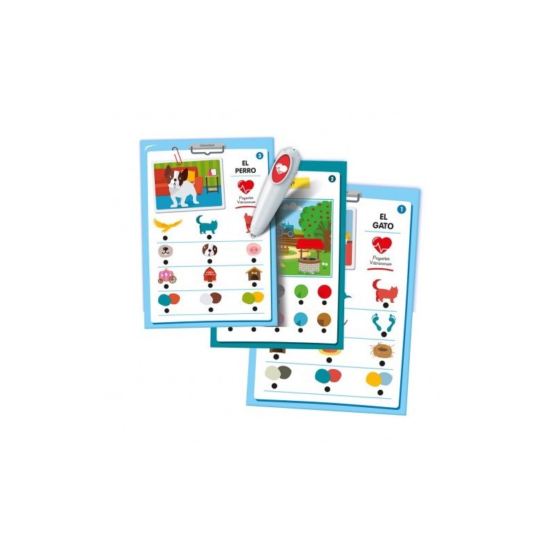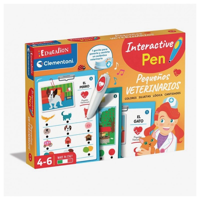 Edad recomendada: +4 años. Tamaño de caja (AxPxA) 37 x 28.1 x 5cm. 6 tarjetas grandes con 12 actividades educativas y más de 100 preguntas que los niños resolverán utilizando el bolígrafo electrónico. Juego Boli Interactivo Veterinaria. Descubre el mundo de los animales como un veterinario de verdad.