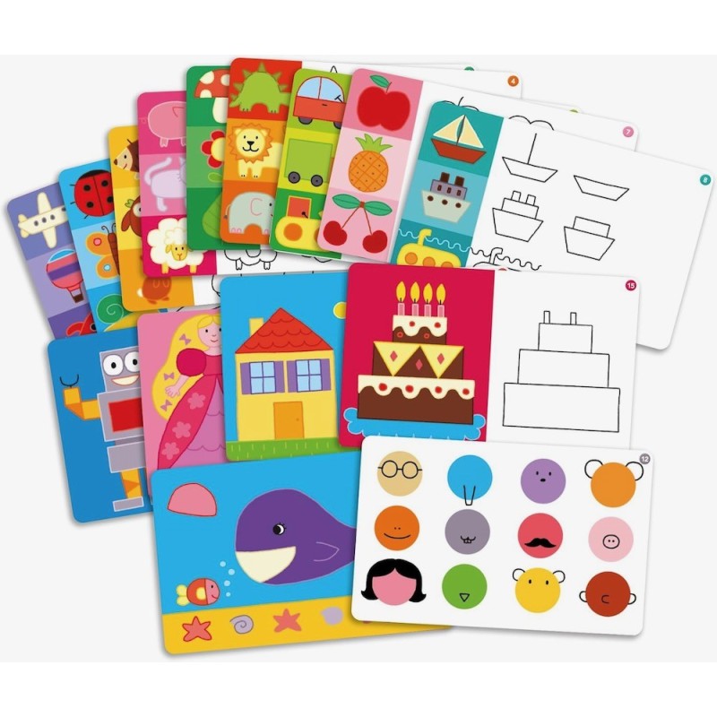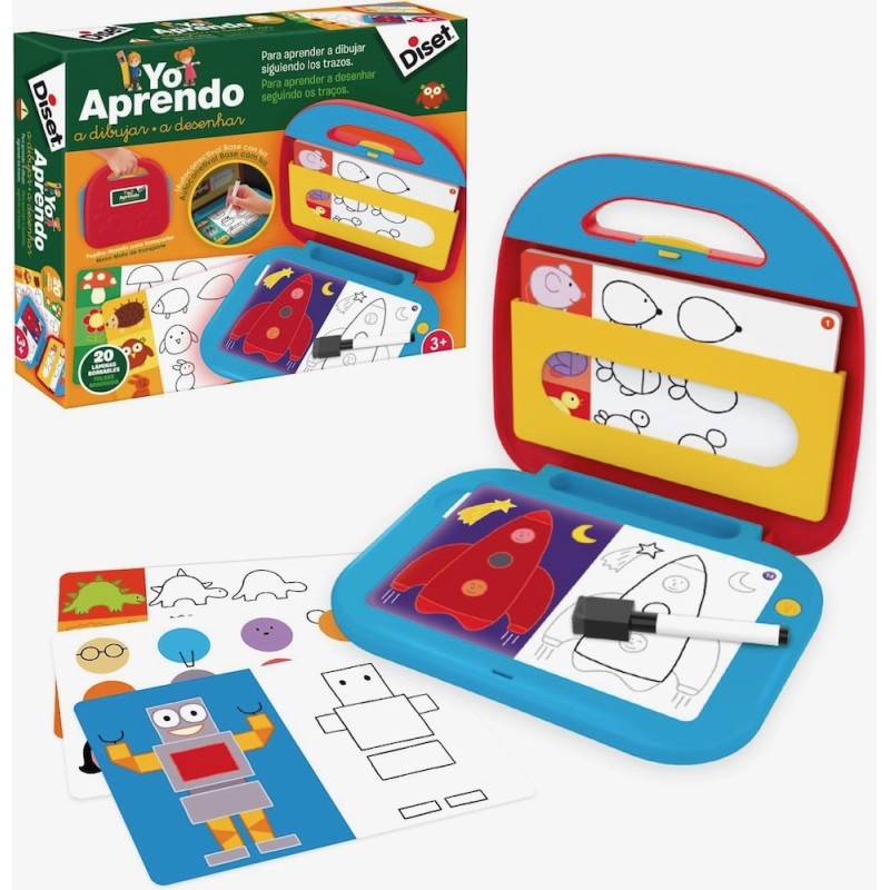 Edad recomendada: +3 años. Juego educativo. ¿Cómo se juega? 1. Se escoge una lámina y se coloca encima del pupitre educativo 2. Al principio, es mejor que se ilumine el pupitre para seguir los trazos repasando el modelo que aparece. 3. Cuando ya se está familiarizado con la lámina se pueden realizar los trazos sin el modelo, con el pupitre apagado. 4. Cuando se acaba un proyecto, se borra la lámina con la pequeña esponja y se guarda en el compartimento. Se cierra la maleta y ésta se apaga automáticamente.
