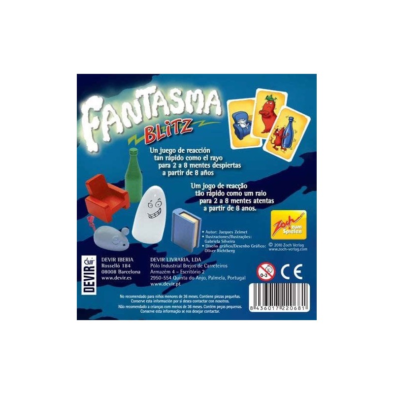 Juego de reflejos para 2 a 8 jugadores de fulminantes reacciones Uno de los jugadores gira la carta superior de la baraja de tal manera que quede visible para todos Entonces los jugadores deben intentar coger el objeto que coincida, en todo incluso el color, con el mostrado en la carta Si no hay objeto que cumpla los requisitos, los jugadores deben coger el que ni se muestre en la carta ni comparta color con ninguno de los objetos que aparezcan en ella El jugador que acierte, colocará la carta delante de él como recompensa y procederá a revelar la siguiente carta del mazo El juego termina cuando la pila de cartas se acaba y el que tiene más cartas ganadas se proclama vencedor Contenido: Cinco piezas de madera (fantasma, sillón, botella, libro, ratón), 60 cartas con ilustraciones. Edad recomendada: +7 años.