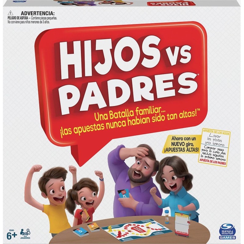 Juego de mesa de pruebas y preguntas HIJOS VS PADRES Hijos vs Padres es el juego de competición para toda la familia en el que los hijos compiten contra sus padres para ver quién consigue la supremacía en casa. Utiliza el marcador de borrado en seco y el tablero de apuestas para escribir las apuestas, y que empiece la competición. Cada equipo debe leerle preguntas sobre su generación al otro equipo. Según vayáis acertando preguntas, debéis moveros por el tablero. Si caéis en una casilla de desafío, tendréis que competir con el otro equipo en un desafío frenético y alocado. Si sois los primeros en llegar al final del tablero, deberéis superar un desafío final para ser coronados como ganadores y disfrutar de la apuesta que acabáis de ganar. ¡En esta noche de juego en familia las apuestas son más fuertes que nunca, y también la diversión! Incluye: 200 cartas de preguntas y de desafío, 1 tablero, 1 reloj de arena, 2 fichas de jugador, 1 marcador para pizarra blanca con soporte, 1 tablero de apuestas con soporte e instrucciones. A partir de 6 años.