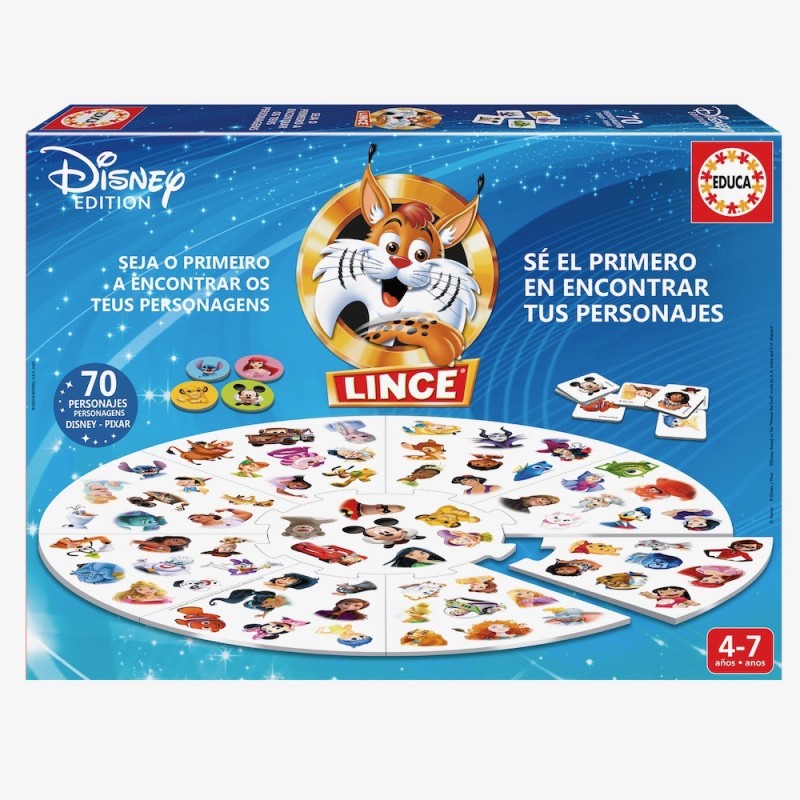 Edad recomendada: +4 años. Lince 70 imágenes es un juego que agudiza la vista y los reflejos ¿Estas preparado para pasar un rato divertido? Pues vamos a jugar este rápido juegos de mesa, toma la ficha y busca la imagen en el tablero. ¿Serás el primer en encontrar a tus personajes? Compuestos por piezas perfectamente acabadas para una sencilla manipulación, debido que este modelo de juego Lince es perfecto para que los pequeños de casa puedan comenzar en el mundo de los juegos de mesa y tablero. Contenido del juego de mesa Lince: 70 Imágenes; tablero, 82 fichas, caja montable e instrucciones. Ahora con nuevos personajes: Lilo & Stitch, Encanto, Úrsula (villana de La Sirenita), entre otros.
