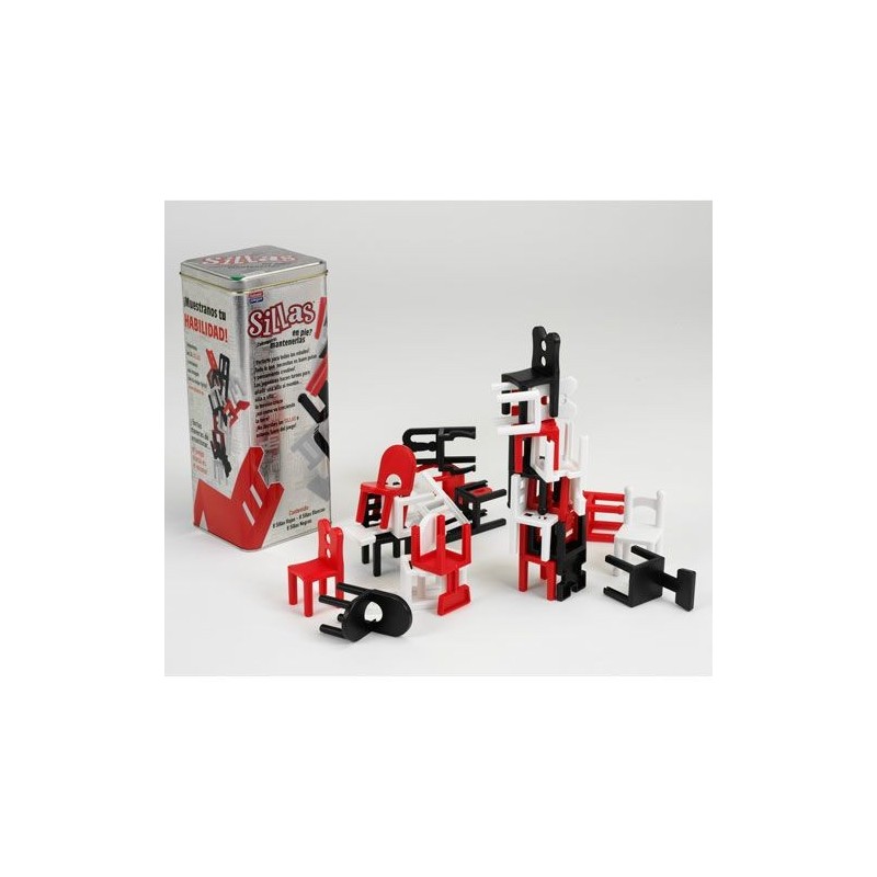 Edad: +5 años_ Jugadores: 2_ El ganador es el jugador con menor puntuación (menos sillas caídas) cuando el número predeterminado de rondas hayan sido completas Las sillas se pueden añadir y aplicar en cualquier dirección, de manera que las sillas no se caigan Cuando añadas con éxito una silla, es el turno del próximo jugador, que intentará apilar otra silla ¡No derribes las sillas o estarás fuera del juego! Contiene 8 sillas rojas, 8 sillas blancas y 8 sillas negras Dimensiones de la caja: 26,6 x 10,5 x 10,5 cm