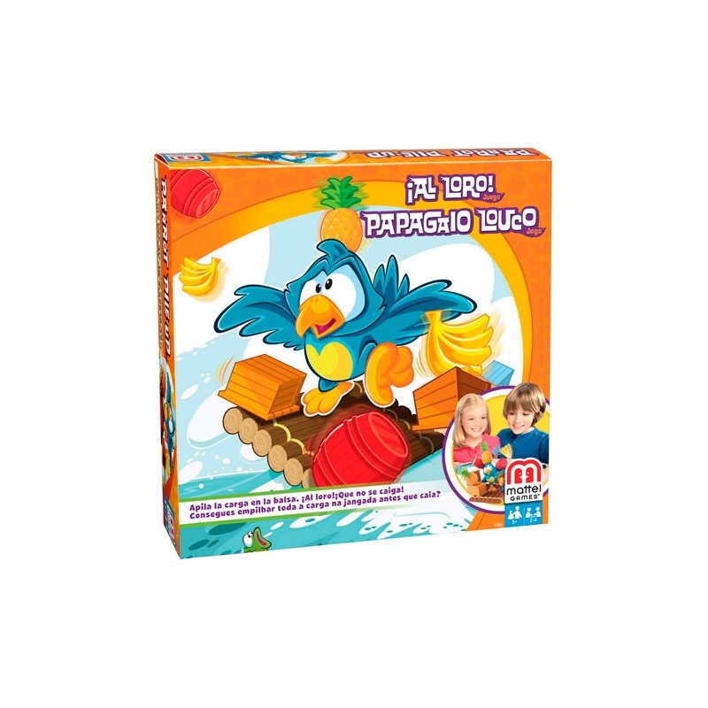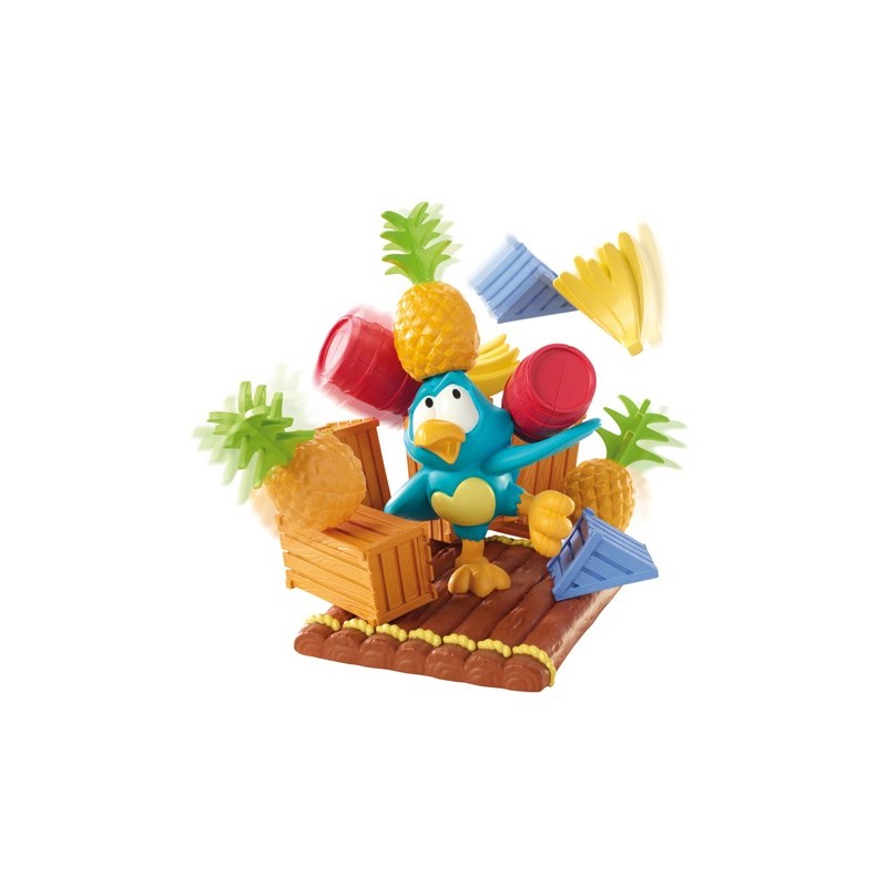 ¡Un loro cargado de diversión! Este juego tropical de habilidad requiere equilibrio, coraje y un pulso firme Los jugadores deben apilar frutas y cajas cuidadosamente sobre la balsa del loro y empujarla hasta el siguiente jugador Si la pila se derrumba, el jugador que estaba empujando la balsa recoge las piezas y se queda con una ¡El primer jugador en deshacerse de toda su carga gana! El nivel de dificultad del juego se puede modificar inclinando la balsa o dejándola en posición horizontal