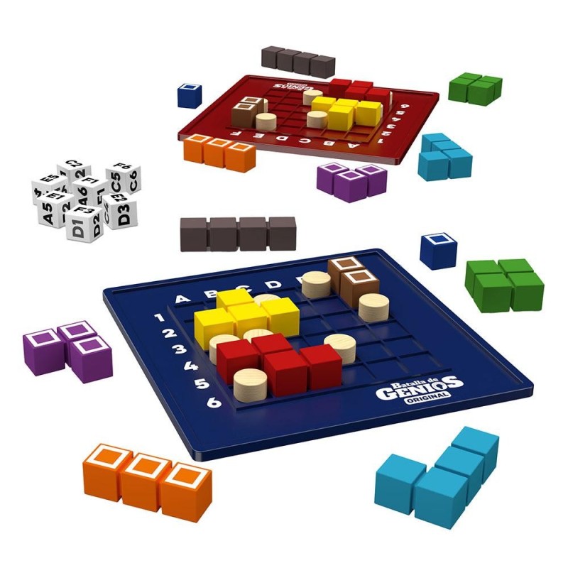 BATALLA DE GENIOS ¿Quién ganará la batalla de genios? Reta a tu oponente a completar el tablero antes que tú. ¡Sé el más rápido en resolverlo! Existen 62.208 combinaciones posibles ¡Y siempre hay una solución! Completa la cuadrícula con las nueve piezas de colores, una vez que se hayan colocado los siete bloqueadores en las posiciones que indican los dados. CONTENIDO: 18 Formas de madera • 7 Piezas bloqueadoras • 7 Dados • 2 Tableros • Reglas de juego Cómo Jugar: 1) Lanza los dados. 2) Coloca los bloqueadores donde hayan indicado los dados. 3) Coloca todas las piezas tan rápido como puedas. El primer jugador que completa la cuadrícula, gana.