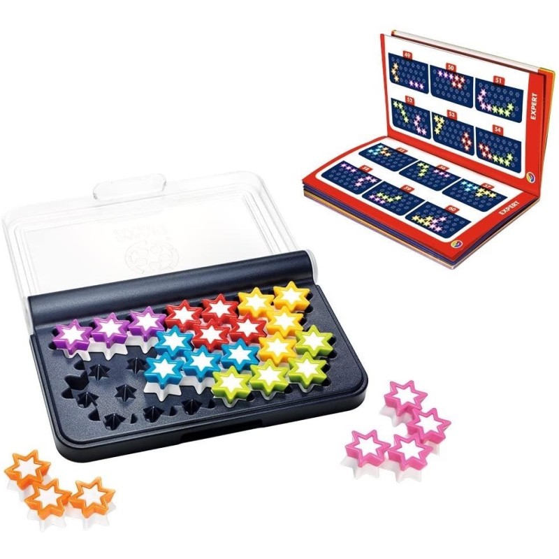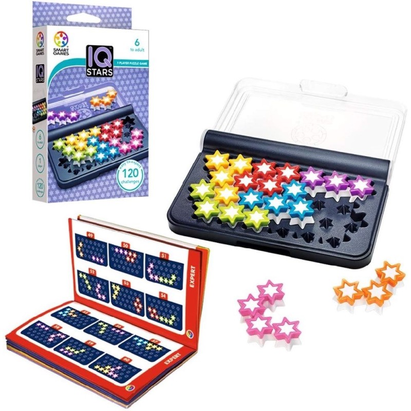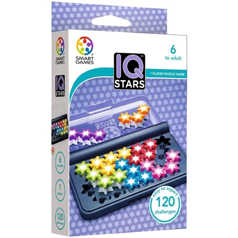Juego IQ Stars ¿Puedes rellenar todo el tablero? ¿Tienes una mente sobrenatural?. ¿Puedes colocar las 7 piezas del rompecabezas en forma de estrella en el tablero?. Alcanze las estrellas y resuelve los 120 desafíos, de fácil a experto. Elige un reto. Coloca las estrellas en la posición que muestre el reto. Coloca el resto de estrellas en el tablero de forma que encajen perfectamente. Solo hay una solución. Puedes consultarla al final del cuadernillo de retos y soluciones.