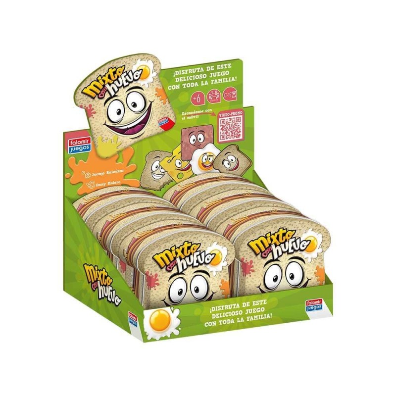 Edad recomendada: +6 años. Mixto Con Huevo es un juego de rapidez visual en el que los jugadores tendrán que ser los más rápidos en identificar patrones (tipos de bocadillos) en el centro de la mesa para ganar la partida. El que consiga todas las cartas será el ganador.