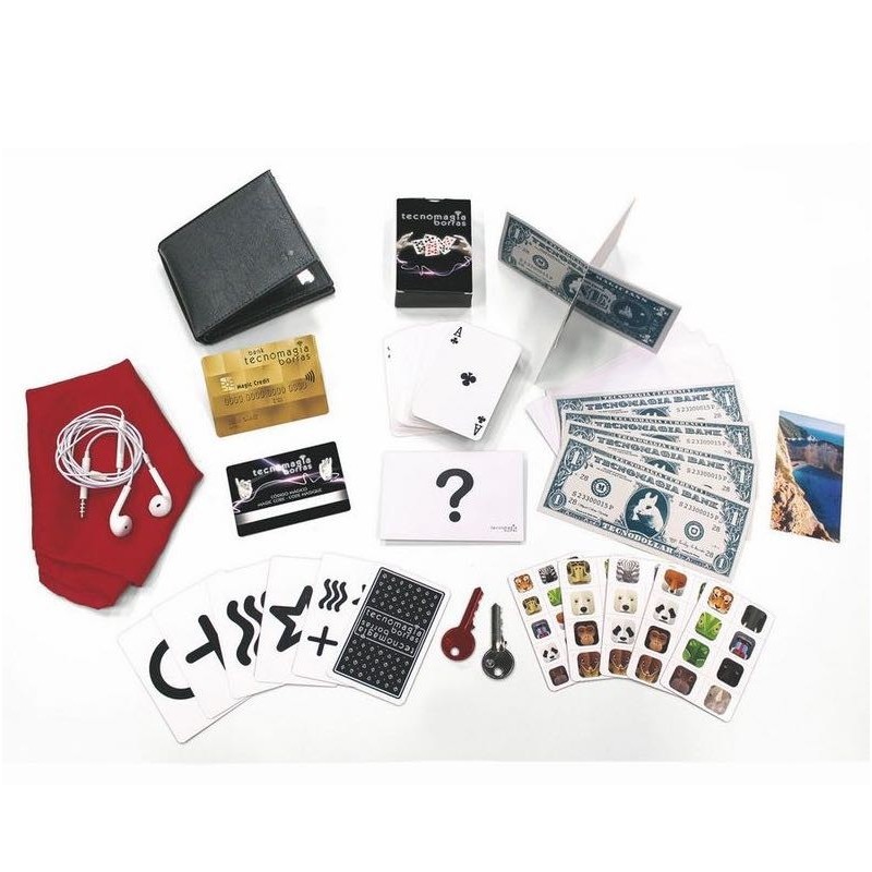 Trucos alucinantes nunca vistos. Predicciones con cartas, adivinaciones, convertir papeles en billetes, hacer que aparezcan tarjetas de crédito y dinero en la cartera, atravesar un billete con los auriculares... Contenido: cartera, auriculares, pañuelo, tarjeta de crédito, 2 llaves, barajas de cartas póker, cartas con dibujos, cartas Xen, papeles/billetes, fotografía, sobres, plástico e instrucciones. Podrás hacer trucos físicos o utilizando además la APP. Edae recomendada: a partir de 6 años.
