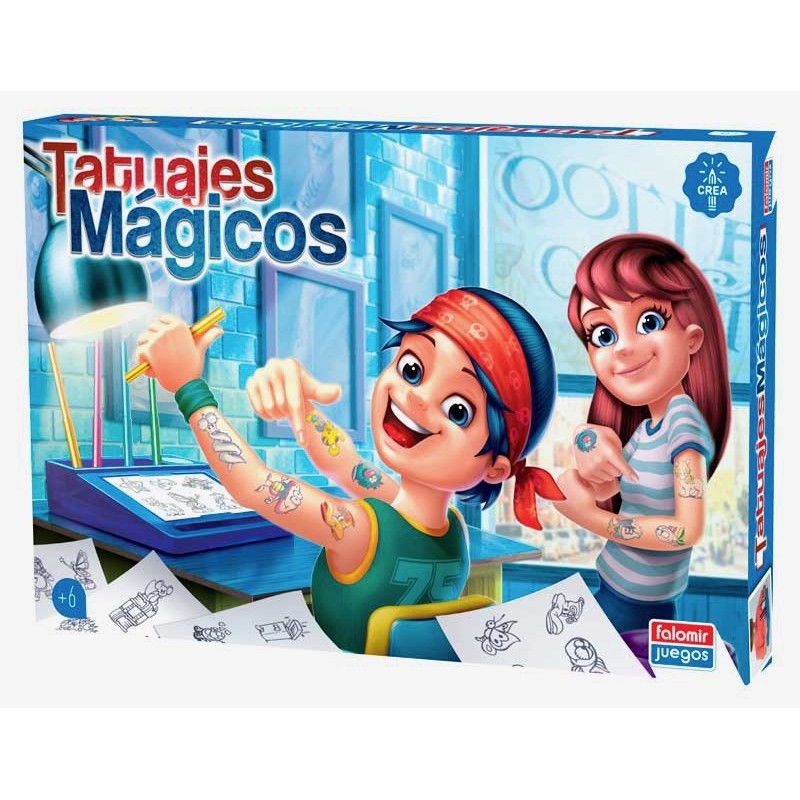 Tatuajes mágicos azul. ¡Crea y decora tus propios tatuajes mágicos! Contiene 4 rotuladores, 1 atril y 25 hojas de papel copia tatuajes. Edad recomendada: +6 años. Dimensiones de la caja: 27 x 38,8 x 5,1 cm.