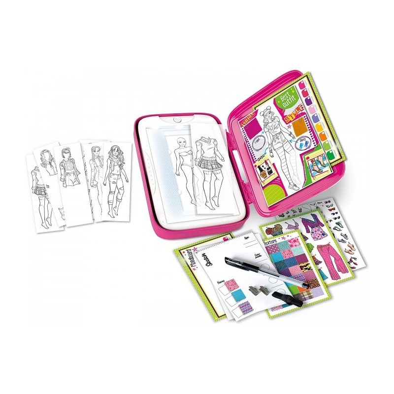 Conviértete en un estilista profesional con este increíble kit de diseñador de moda Create Idea! Abre el maletín rosa y descubre todo el contenido para hacer vestidos increíbles y dar rienda suelta a la imaginación. Coloque el modelo a trazar en la superficie luminosa, la hoja y comience a seguir los contornos con su bolígrafo de tinta para ver un resultado súper moderno. Colorea y usa pegatinas de pegar y pelar para hacer que tus borradores o patrones sean impecables y únicos, ¡como tú! Edad recomendada. +7 años.