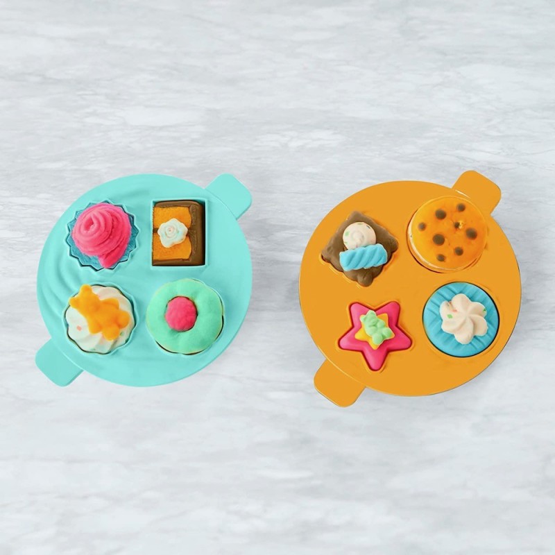 Crea increíbles pastelitos, galletas y tartas de juguete con la Batidora mágica Play-Doh de Kitchen Creations. Los y las aspirantes a pasteleros/as pueden jugar a hornear muchas golosinas colocando 1 de las bandejas de moldes Play-Doh en el bol removible, rellenando cada molde con plastilina y bajando la palanca para estampar raras galletas y tartas con formas alocadas. Edad recomendada: +3 años.