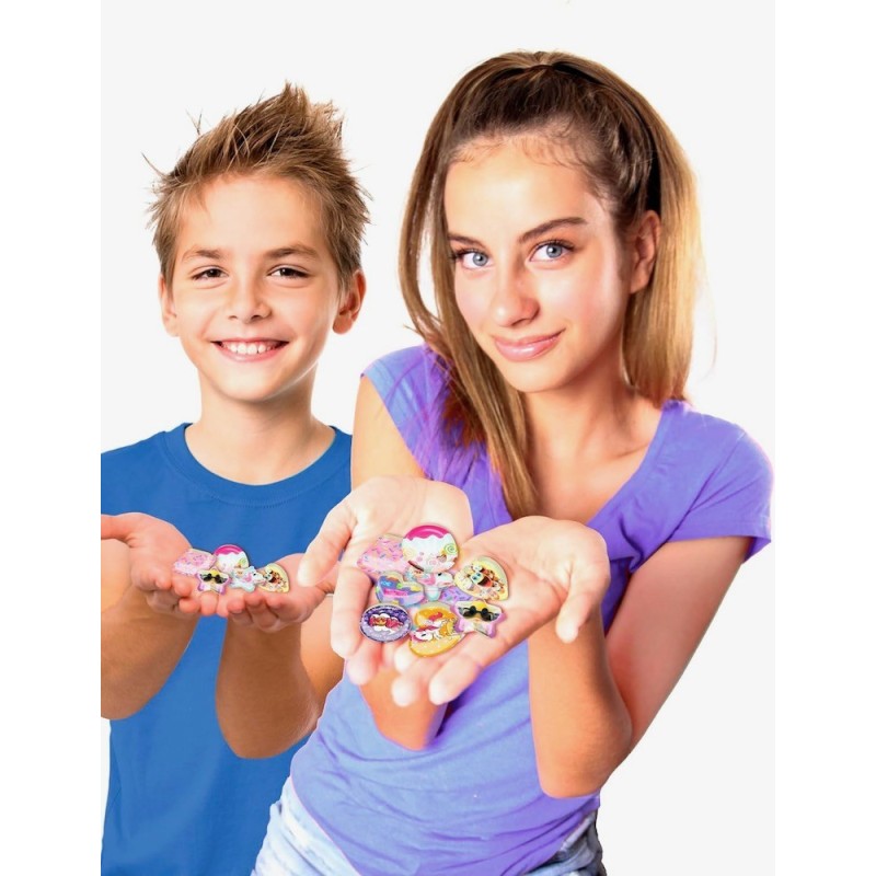 Edad recomendada: +6 años. ¡Divertida máquina con forma de smiley para crear stickers personalizados y poder pegarlos donde quieras! Contiene blisters de diferentes formas, divertidos fondos para las pegatinas, 1 paquete de sprinkles, 2 de purpurina y 250 gemas de colores para decorar el interior y adhesivos de doble cara para pegarlo donde quieran. Es muy sencillo, solo tienes que elegir la forma de la pegatina que quieras hacer: estrella, corazón, circulo… abrir la máquina y colocarla en la base siguiendo las instrucciones. Después podrás añadir la purpurina, las gemas, lo que quieras, seleccionando el fondo y listo! Solo tendrás que cerrar la tapa de la máquina y apretar el botón superior y saldrá la pegatina por la boca.