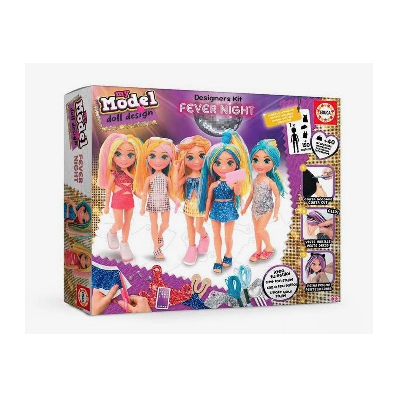 Edad recomendada: +6 años. Juego my model doll fever night. La caja incluye todos los elementos necesarios para crear conjuntos de moda ?Fever Night?: ropa de calle, deportiva, para el día a día. Contenido: - 1 muñeca articulada para montar - Tela con patrones preimpresos - Accesorios de moda - Clips para ropa - Lana para pelo 1 herramienta perforadora - Instrucciones y video instrucciones.