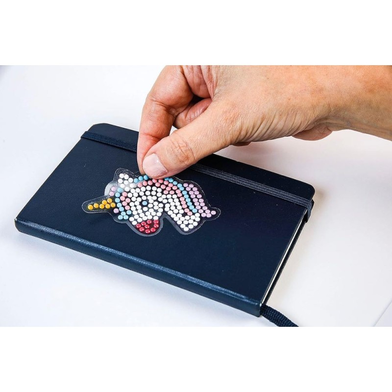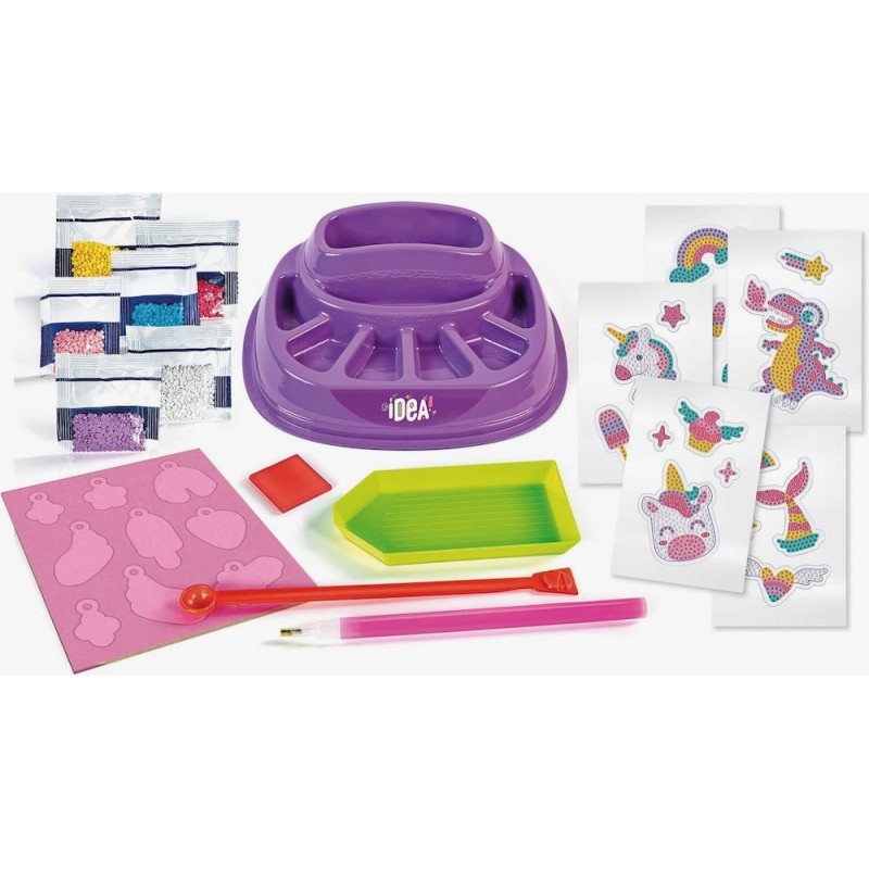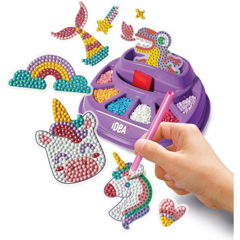 Edad recomendada: +7 años. ¡Un nuevo juego basado en la actividad de los diamantes para crear creaciones brillantes y coloridas! CARACTERÍSTICAS: Gracias a la guía de color y al bolígrafo correspondiente, se pueden aplicar fácilmente las gemas 3D en stickers de diseño original y divertido. Gracias al práctico soporte para accesorios, puedes mantener todos los componentes ordenados STICKERS: En esta versión las ilustraciones son temáticas de fantasía, con unicornios simpáticos... ¡también colecciona las otras versiones de la línea Sparkly Creations de Idea!