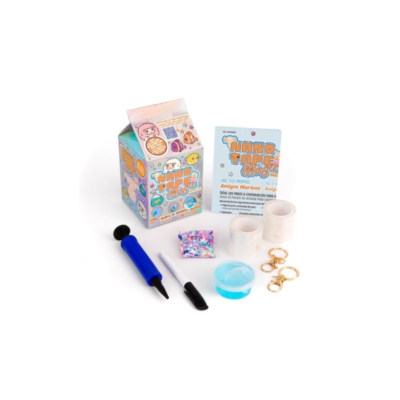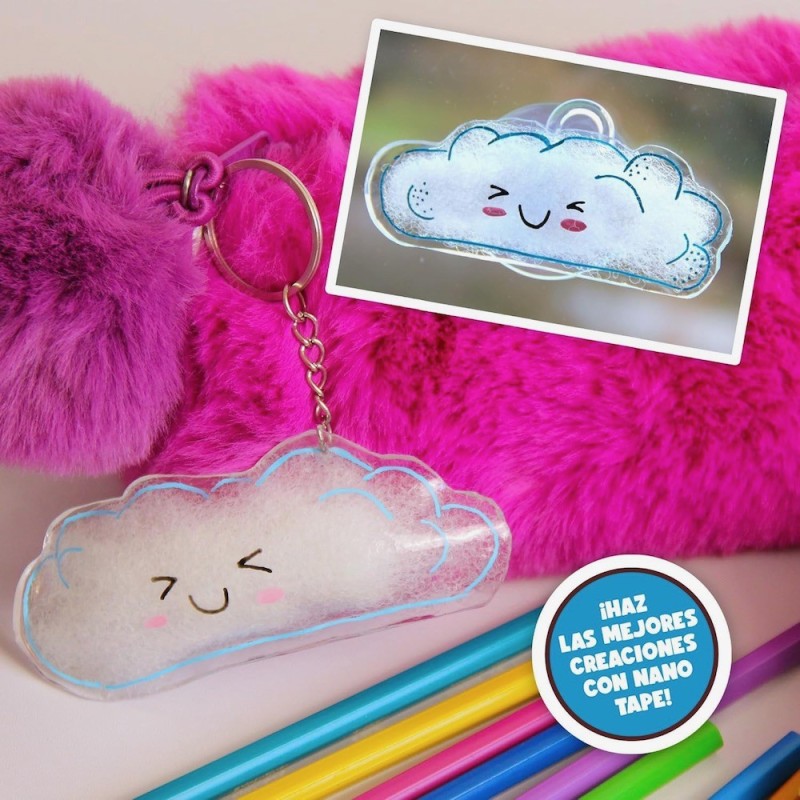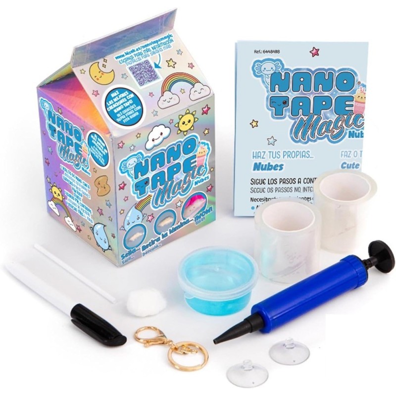 Edad recomendada: +6 años. Tus primeros pasos con Nano Tape gracias a los mini pack de Nubes y Animales. Puedes hacer nubes de algodón, llaveros, pececitos de colores, diseños con slime.. ¡todo con un mismo kit! Trae todo lo necesario para poder crear sin parar. Todos los kits contienen un QR con contenido extra y creaciones adicionales.