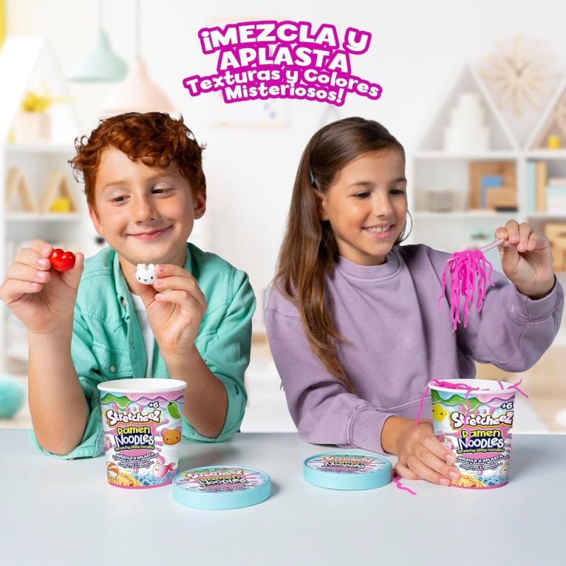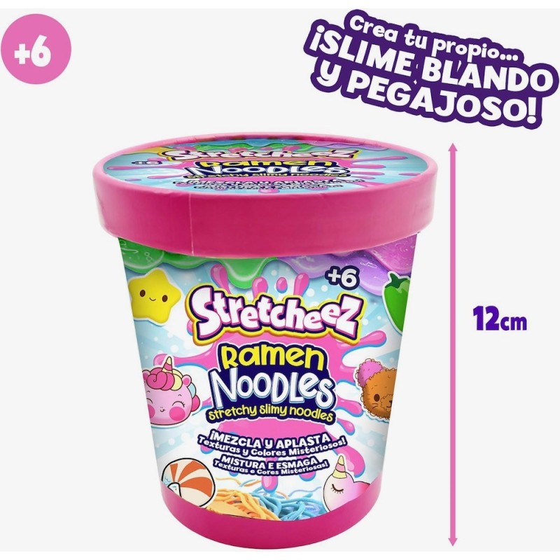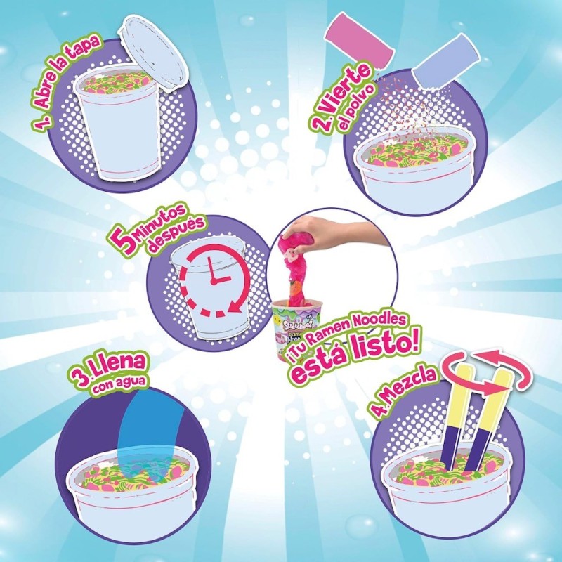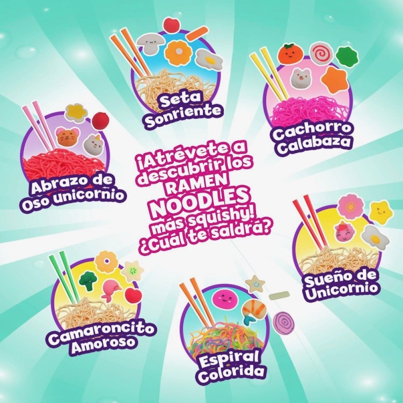 Edad recomendada: +6 años. ¿A quién no le gusta un buen ramen? ¡Ahora puedes hacer el tuyo con un toque mágico! Sólo mezcla el polvo con agua y observa como se transforma en un slime de colores, listo para darle vida a tu ramen. Los noodles son stretchy perfectos para estirar y jugar sin ensuciar. Completa tu colección con topping squishy, ideales para apretar y mezclar como quieras. Colecciona los 6 ramen diferentes y disfruta de infinitas combinaciones mix and match.