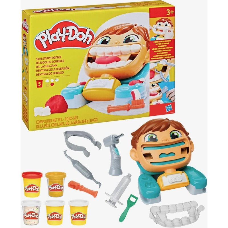 Dentista de juego: todo el mundo sonreirá jugando al dentista con este juguete de odontología Play-Doh y los 7 accesorios incluidos DIENTES FÁCIL DE CREAR: Simplemente presione al paciente contra la silla del dentista para dar forma a todos los dientes ficticios al mismo tiempo. Crea un Play-Doh de lengua rigolote: añadiendo un poco de arcilla de modelado Play-Doh y presionando hacia abajo, puedes sacar su lengua de una manera divertida. Listo para examinar: incluye herramientas temáticas de odontología Play-Doh como una sonda, pinzas, soporte para hilo dental y cepillo de dientes. 5 botes, incluidos colores temáticos: las macetas de arcilla Play-Doh de 1.98 oz en este juego incluyen 2 tarros blancos, 1 maceta roja, 1 maceta dorada y 1 frasco blanco con caries verdes como confeti.