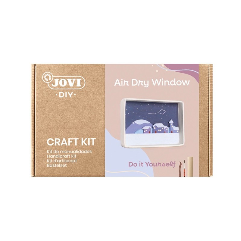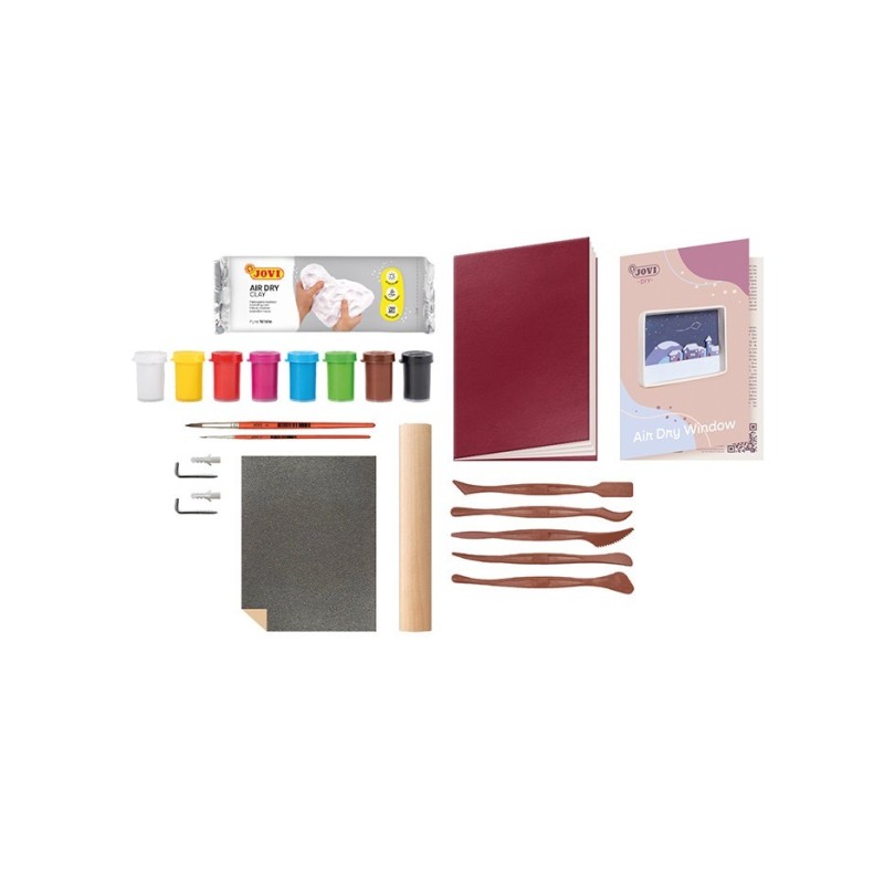 Medidas: 25 x 16 x 5 cm. Kit de manualidades para hacer una ventana con paisaje con pasta endurecible Air Dry. Incluye instrucciones paso a paso con enlace al vídeo tutorial, pastilla de AirDry de 500g, 1 rodillo de madera, 5 herramientas de modelaje, 1 hoja de papel de lija, 8 colores de pintura Gouache Tempera de 15ml, 2 pinceles calibrados, 1 libreta, 2 ganchos y 2 tacos. 24 ítems Instrucciones Vídeo