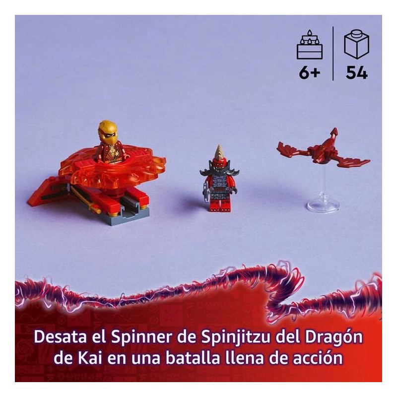 Con el juguete de acción Spinner de Spinjitzu del Dragón de Kai (71823), los peques podrán recrear las emocionantes escenas de la temporada 3 de la serie NINJAGO®: El renacer de los dragones. A los niños y las niñas a partir de 6 años les encantará construir este pequeño set LEGO® antes de pulsar el botón que lanza el juguete Spinner de Spinjitzu del Dragón de Kai girando a gran velocidad hacia el objetivo. Cuando impacte, ¡2 elementos de poder podrían salir despedidos! Este juego contiene 2 minifiguras: Kai, con una espada y montado en el spinner de Spinjitzu del Dragón, y el infame explorador Dragónido, con un hacha, además de un modelo de una criatura dragón. Los niños podrán representar batallas entre el bien y el mal con estos populares personajes del universo NINJAGO.
