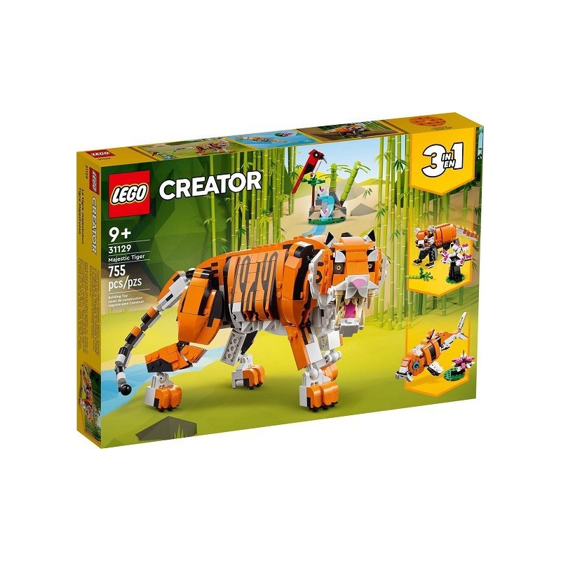 A los amantes de los animales de 9 años o más les encantará interpretar divertidas historias con el fascinante set LEGO® Creator 3en1 Tigre Majestuoso (31129). Contiene un modelo de un tigre para construir provisto de cola, patas, cuerpo, hombros, cabeza y mandíbula articulados al que puedes cambiar la expresión facial. Juguetes LEGO llenos de apasionante juego imaginativo Este set de juguetes 3en1 ofrece a los niños al menos 3 experiencias de construcción y juego. Pueden dar forma a un tigre articulado con un pájaro rojo, convertirlo en un panda rojo articulado con bambú y un bonsái, transformarlo en una carpa koi con cola y aletas móviles acompañada de nenúfares, o usar su imaginación y crear otro animal. Una experiencia digital para constructores LEGO El set trae instrucciones de construcción digitales para aportar aún más diversión al proceso. Además, los peques pueden visualizar el modelo según lo construyen con las herramientas de la app gratuita Instrucciones de MontajeLEGO. Edad recomendada: +9 años.