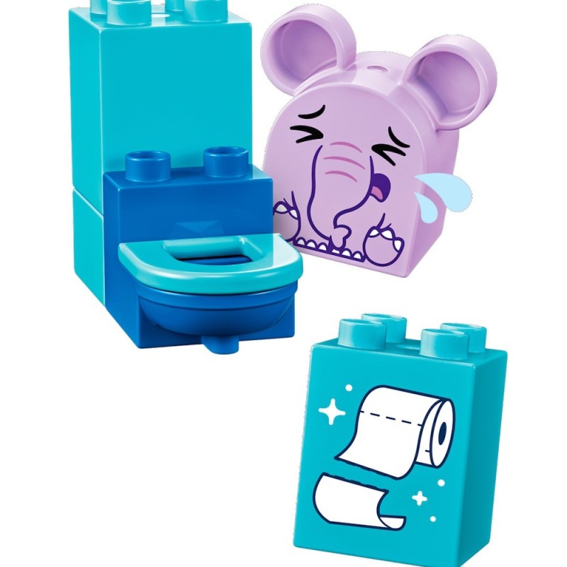 Ayuda a tu preescolar de 18 meses o más a entender lo que siente cuando llega el momento de lavarse con el juguete de aprendizaje para bebés Rutinas Diarias: Hora del Baño (10413) de la gama Mi Primer. Este juego incluye 2 elefantes de juguete (uno adulto y otro bebé), una bañera, una ducha y un inodoro. Los papás y su preescolar visitarán el baño con sus nuevos amigos LEGO® DUPLO® animales y se lo pasarán genial interpretando que lavan a la cría mientras exploran la importancia del aseo. Estejuguete para el desarrollo social y emocional viene con una figura de una cría de elefante cuya expresión facial alegre o triste ayuda a los bebés a explicar sus sensaciones en torno a las rutinas de aseo. Este juego basado en la hora del baño también es fantástico para empezar a enseñar a los bebés a usar el orinal.