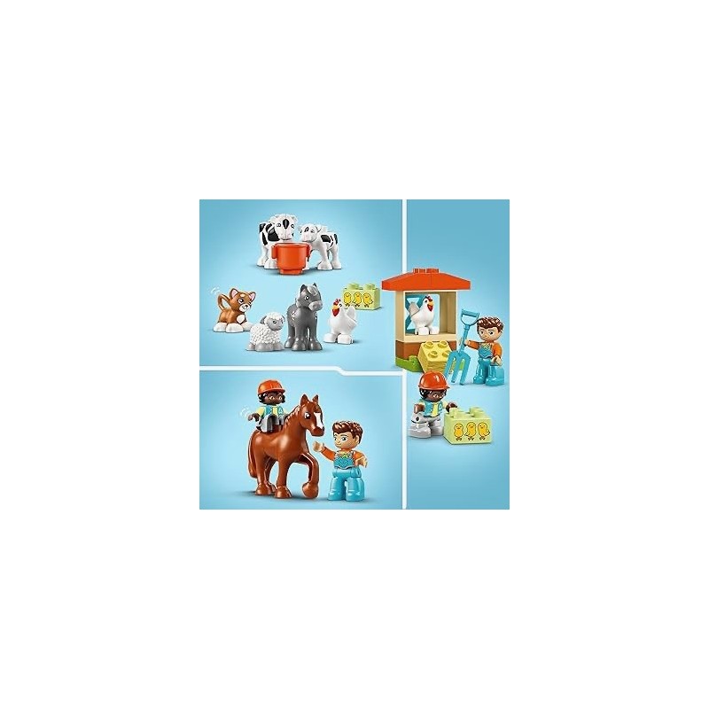 ¿Conoces a un bebé que adore los juegos de granja? El set Cuidado de Animales en la Granja (10416) es el regalo ideal para jóvenes amantes de los animales. Este juguete de aprendizaje para bebés de 2 años o más incluye 8 figuras LEGO® DUPLO® de animales (como una oveja, una vaca, un caballo y pollitos) y entusiasmará a los preescolares que disfrutan con los juguetes basados en interpretar actividades de la vida real, ¡o haciendo nuevos amigos! El detallado juguete implica a toda la familia en el juego afectivo y permite a los papás enseñarle a su bebé a alimentar a los animales y cuidar de ellos. El granjero, en la casa de labranza, ayuda a la figura del niño a lavar las manzanas para dar de comer a la vaca y el ternero. En el gallinero,la gallina cuida de sus pollitos. Los bebés también pueden imaginar que pasean a lomos del caballo y le dan heno en el establo.