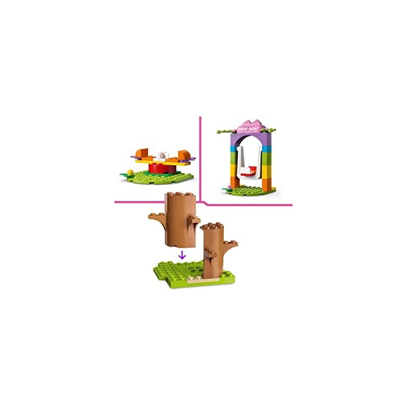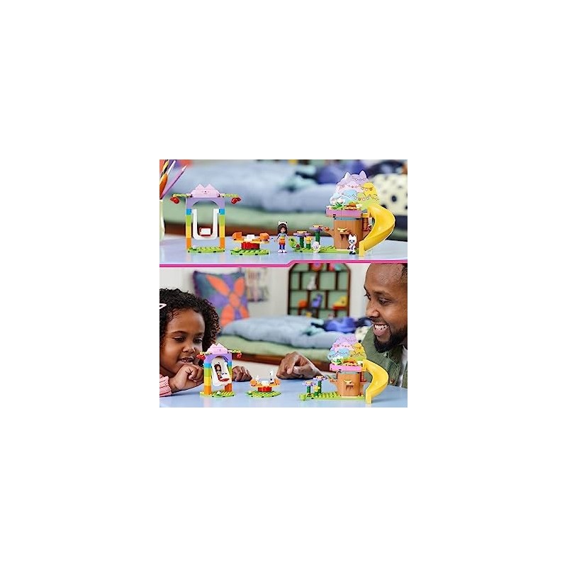 Lleva a tu fan de La Casa de Muñecas de Gabby de 4 años o más a un lugar mágico lleno de diversión, amigos e infinitas posibilidades de juego con el set LEGO® Fiesta en el Jardín de Hadigata (10787). Casa del árbol de juguete repleta de actividad Gabby, Pandy Patitas y Hadigata, de la popular serie para televisión, beben té en la casa del árbol, donde Hadigata tiene una cama y tentempiés de fresa. Hay flores que los jóvenes jardineros y jardineras pueden cultivar, y también un tobogán, un columpio y un carrusel para jugar con los amigos. Los accesorios, como las manzanas, la regadera, la tetera, las tazas y las mariposas, animarán a los niños a explorar el juego de interpretación imaginativo. La caja contiene una guía de construcción con historia visual y la app digital LEGO Builder cuenta con intuitivas herramientas de acercamiento y giro. Igual que todos los sets LEGO 4+, este juguete incluye un ladrillo para principiantes que permite empezar a construir y divertirse de inmediato.