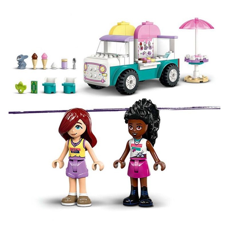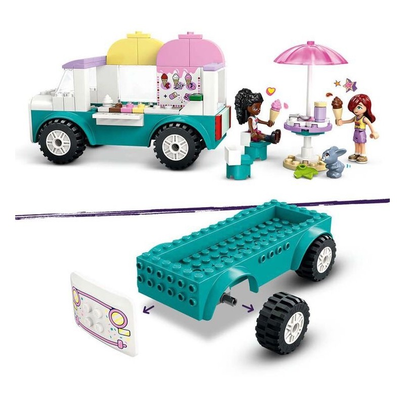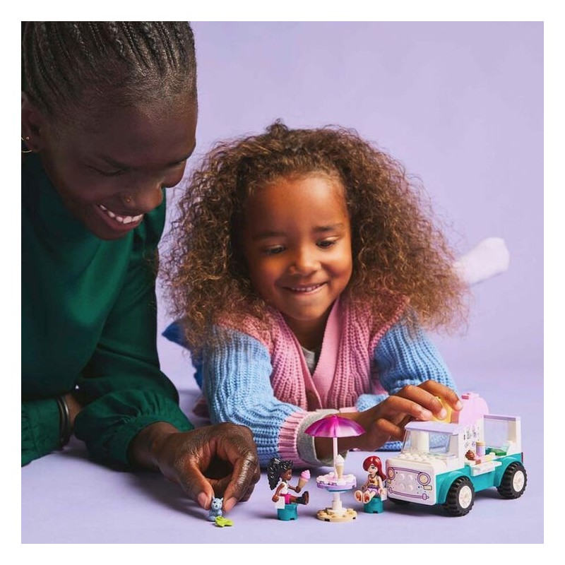 ¡Aquí tienes un dulce regalo para tu joven entusiasta del juego de interpretación! Las niñas, los niños y los constructores a partir de 4 años podrán imaginar divertidas interacciones vendedora-clienta con el set de juguetes LEGO® Friends Camión de los Helados de Heartlake City (42644). El kit de construcción ayuda a los peques a aprender a construir e incluye una heladería móvil, 2 minipersonajes, una figura de una conejita y accesorios. Este set es un fantástico regalo para mayores de 4 años. Disfruta viendo cómo se desarrolla la creatividad de tu peque mientras interpreta que Paisley prepara un helado para su amiga Elsa D. El juego trae cucuruchos y helados de diferentes sabores (chocolate, fresa y vainilla), una cuchara, un bote de virutitas, un paraguas, 2 sillas, una caja registradora y dinero.