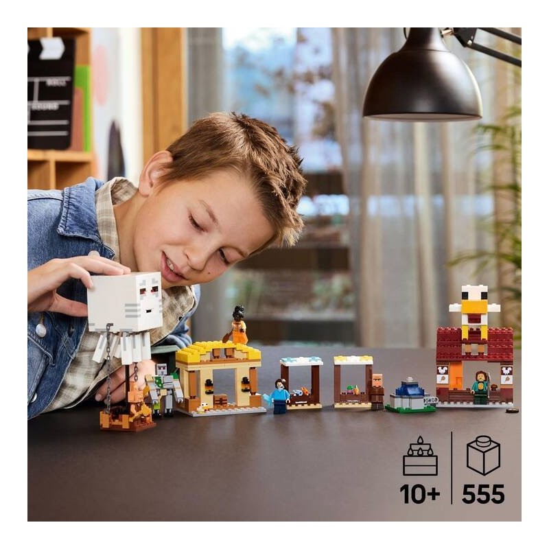 El Ataque a la Aldea del Globo de Ghast (21273) es un set de construcción que representa una escena de la película Minecraft®. Este juguete LEGO® Minecraft de alta calidad basado en el videojuego, que es una estupenda idea de regalo para niños y niñas a partir de 10 años, presenta la acción explosiva que tiene lugar cuando se lanza un ataque desde un globo. Cuenta con personajes populares del videojuego: Steve, Natalie, Dawn, 2 Piglins, un globo de Ghast, un aldeano, una gallina bebé y una figura de un gólem de hierro articulada. El globo tiene espacio para los Piglins e incorpora un lanzador de discos. La aldea incluye puestos del mercado, el restaurante de pollo frito de Steve, su choza de fabricación y una fuente, que tu peque puede hacer “explotar”. El tejado del restaurante exhibe una gran gallina que “pone” huevos. Combina el juego físico con la diversión digital que ofrece la app LEGO Builder, que permite a tu peque acercar y girar los modelos en 3D y seguir sus progresos.