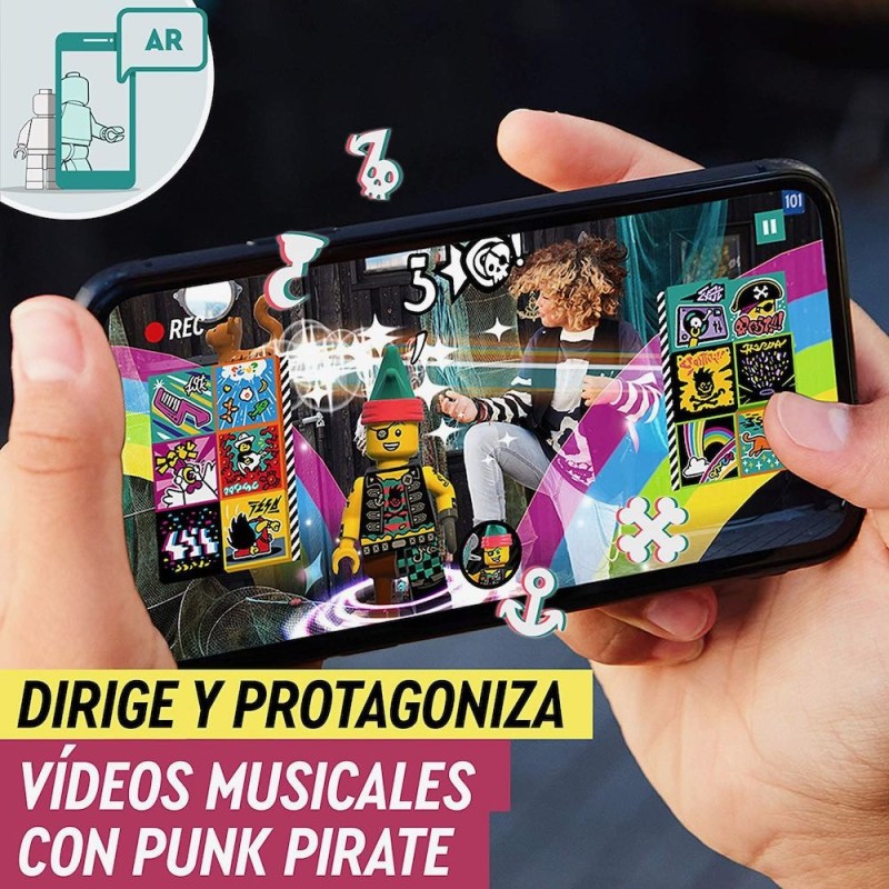 Abre las puertas del mundo de la creación de vídeos musicales a los niños que adoran bailar y actuar con el set LEGO® VIDIYO™ Punk Pirate BeatBox (43103). Descarga la app gratuita, escanea la minifigura y descubre la arrolladora personalidad del Punk Pirate sobre el escenario. Después, escanea los BeatBits para desbloquear efectos especiales, desafíos y más. Tu peque podrá producir exclusivos vídeos musicales y compartirlos con otros creadores en una fuente social segura para ellos. Diversión portátil La BeatBox se cierra y dentro caben la minifigura y los BeatBits. A los niños les encantará decorarla con las piezas LEGO. Podrán elegir entre un ancla, un cofre del tesoro o un barco pirata, o crear su diseño. Experiencias musicales Los sets LEGO VIDIYO ofrecen una experiencia de juego social segura y ayudan a los peques a convertirse en directores, productores y estrellas de creativos vídeos llenos de mezclas musicales, divertidos personajes, canciones, coreografías y efectos geniales. Edad recomendada: +7 años.